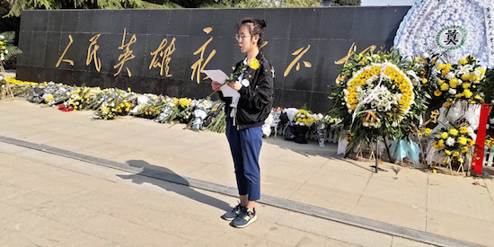 会计1603班欧阳榕襄作为代表致悼词。她说到,矗立在大家面前的烈士丰碑,诉说着英雄们光荣而无悔的事业,岁月的风尘早已在它身上刻下斑驳的印记,让大家无法不回想起那段沧桑沉重的往事。七百余位革命烈士长眠于此。他们为追求救国救民的真理抛头颅,洒热血;为中华民族的解放事业前仆后继,视死如归。作为新时代的莘莘学子,更应充满爱国之情,树立报国之心,努力学习,继承先烈遗志,为家乡的建设、为祖国的富强而努力奋斗。