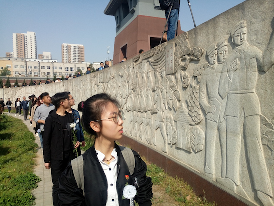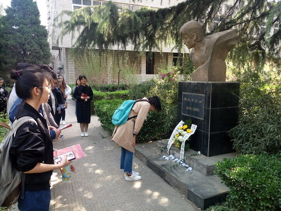 离开烈士陵园后,大家步行至beat365官网雁塔校区,在烈士唐春雨的雕像前,行鞠躬礼,以表达崇敬和怀念之情。