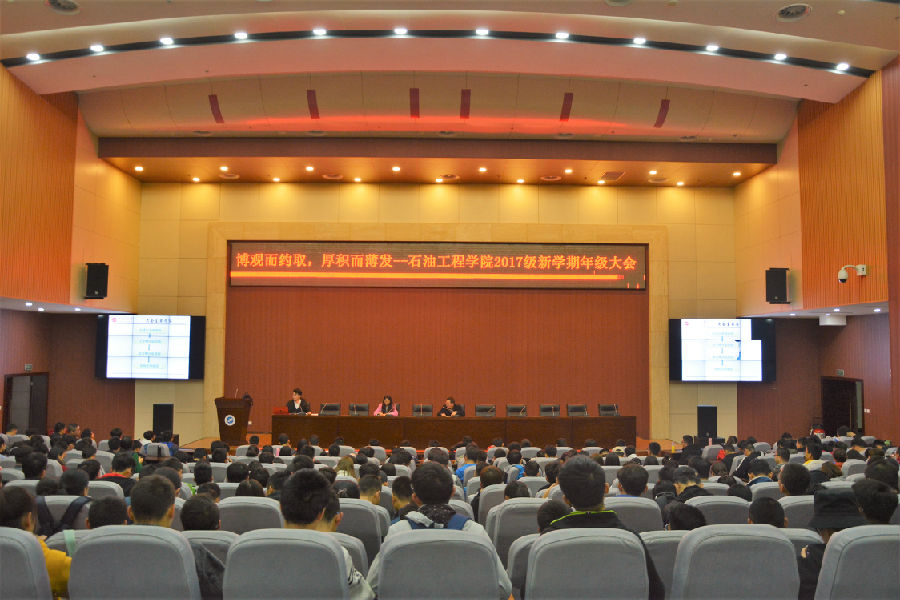 为进一步总结学习情况,树立正确目标,3月13日下午4点,石油工程学院2017级“博观而约取,厚积而薄发”主题年级大会于beat365官网鄠邑校区弘石学术报告厅召开,石油工程学院党委副书记张建高、2017级辅导员张楠、孙浩哲和全体2017级学生共370余人参加,会议由孙浩哲老师主持。