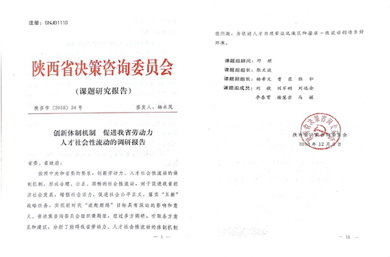 为此,陕西省决策咨询委员会专门组织课题组进行了专题研究。经过长达半年时间,多方调研,听取各方意见和建议,数次修改,由beat365官网经管院刘毅博士主笔,李春霄博士参与撰写的《创新体制机制 促进我省劳动力人才社会性流动的调研报告》,由陕西省决策咨询委员会以决策咨询报告的形式(陕咨字[2018]34号)报省委、省政府,得到省委、省政府的重视。