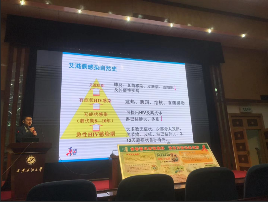 近年来,在校大学生感染艾滋病比例有所增加。艾滋病尚不可治愈,但只要洁身自好,纠正不良行为,完全可以预防。讲座呼吁同学们要提高自我保护意识,摒弃吸烟、酗酒等不良习惯,珍爱生命,远离毒品,注意献血与输血的环节等。