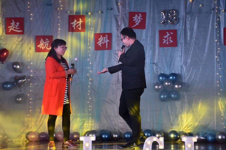 第一篇章:挥洒青春。四位2018级新生们用唯美的歌声演唱《Lucky》,表达了大一新生踏进大学校园的美好愿望。随后,材料类1802班演绎的小品《同桌的你》通过幽默诙谐的独白和搞笑丰富的肢体语言生动展现了大学生对友情的珍惜和感动。歌曲《违背青春》和说唱《目不转睛》将晚会气氛推向高潮。接下来由宋二鹏老师和侯阳老师表演的相声《创业》,一捧一逗之中表达了对我们未来的殷切期望。来自学生助理们表演的《小人舞》,小小的身体,大大的能量,为观众带来了不一样的精彩。