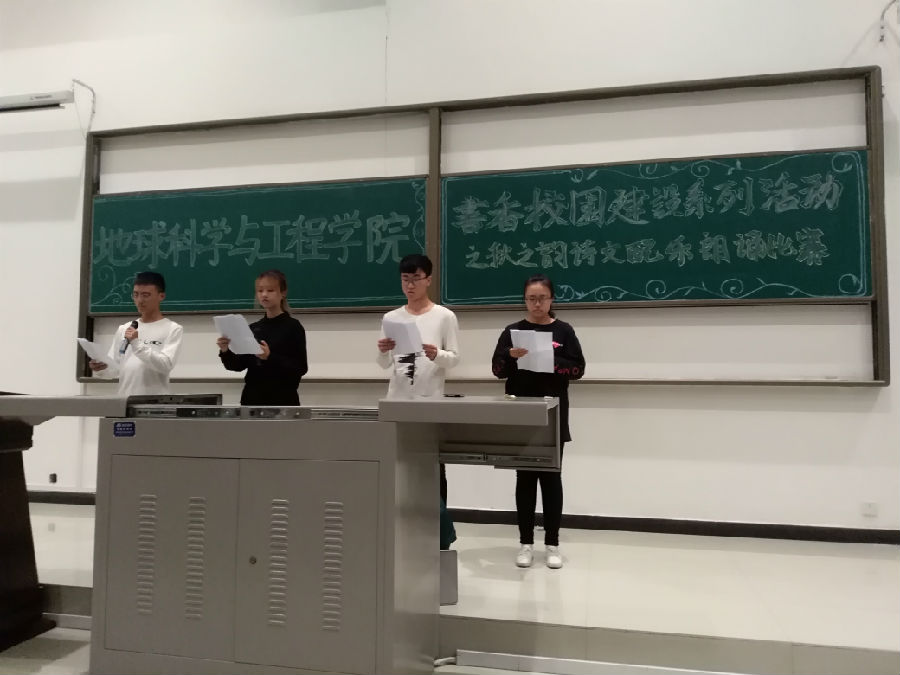 为响应学校“书香校园”建设的号召,按照校团委关于举办第十二届“秋之韵”诗文配乐朗诵比赛相关通知的精神,10月17日晚19:30,地球科学与工程学院在鄠邑校区石工地科楼115教室举办“秋之韵”诗文配乐朗诵比赛初赛。院团委学生会主要成员和第十一届“秋之韵”诗文配乐朗诵比赛获奖同学担任此次比赛评委,辅导员李化杰老师应邀出席比赛,2018级全体同学观看了比赛。