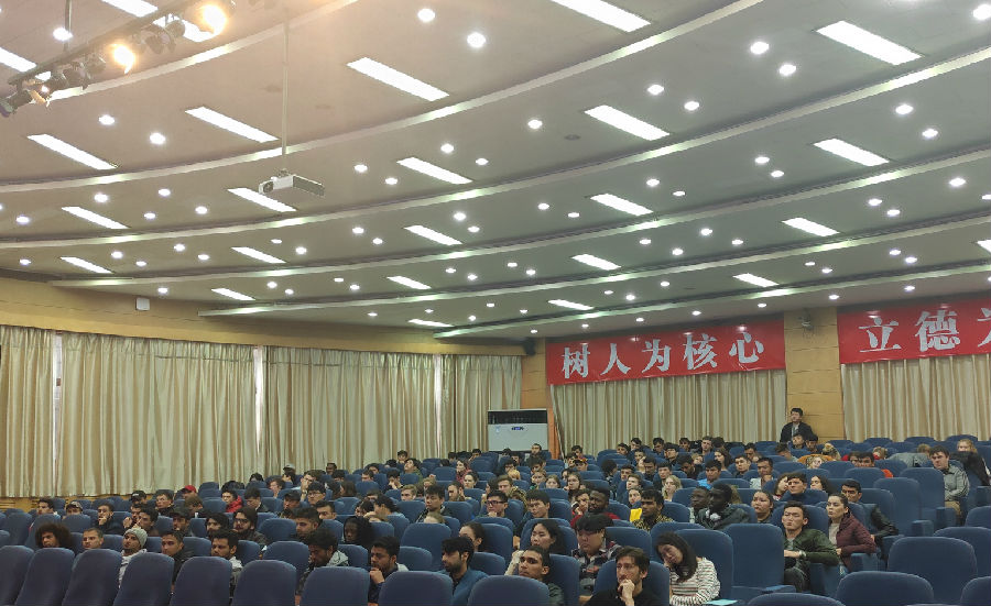 beat365官网保卫处消防科李奎老师详细介绍了学校保卫处的机构设置和工作职能,并就来华留学生校内住宿、交通安全及日常行为规范等事项予以详细讲解。