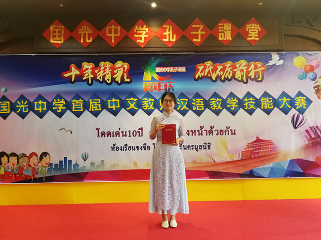 2018年9月10正值中国的教师节,泰国国光中学孔子课堂举办了特殊的庆祝活动“国光中学首届中文教师汉语教学技能大赛”,希望在这个特殊的日子里让老师能够以赛促教,以赛促学,能够更好的发展对外汉语教学。beat365官网汉语国际教育专业17级在读硕士、汉语国际教师志愿者党杏丹同学在此次活动中荣获三等奖。