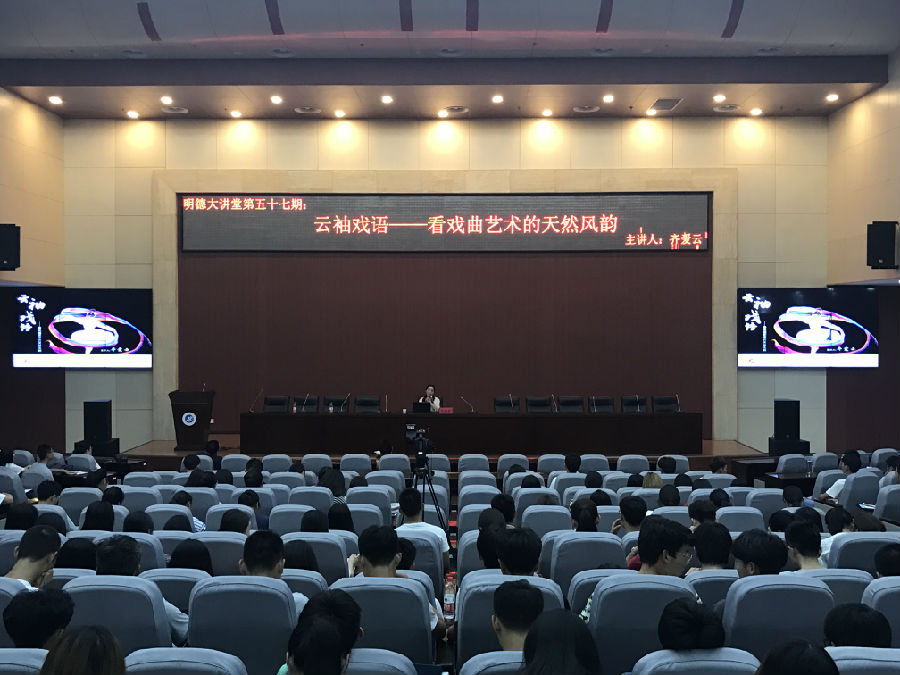 6月14日晚,由校团委主办,人文学院团委承办的第五十七期明德大讲堂《云袖戏语——看戏曲艺术的天然风韵》在鄠邑校区图书馆弘石学术报告厅成功举办。著名秦腔艺术家齐爱云女士应邀担任主讲,鄠邑校区400余名师生听取了此次讲座。