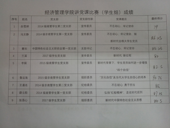 本次比赛由学院党务干部担任评委,各党支部推荐的九名党支部干部参赛,评委根据党课选题、党课内容、语言表达、个人仪态和现场效果进行打分。参赛选手紧紧围绕“不忘初心跟党走,牢记使命勇担当”主题,准备充分,内容详实,声音洪亮,仪态得体,深受现场师生的一致好评。