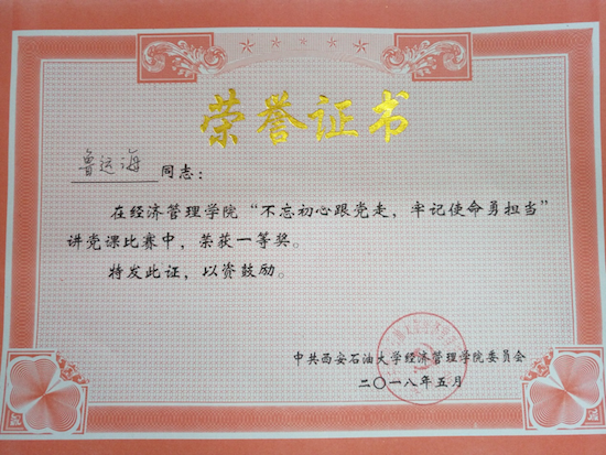 最终经过激烈比拼,经济管理学院2015级非商管学生党支部组织委员鲁运海同志获得一等奖,由闫书记为其颁奖。
