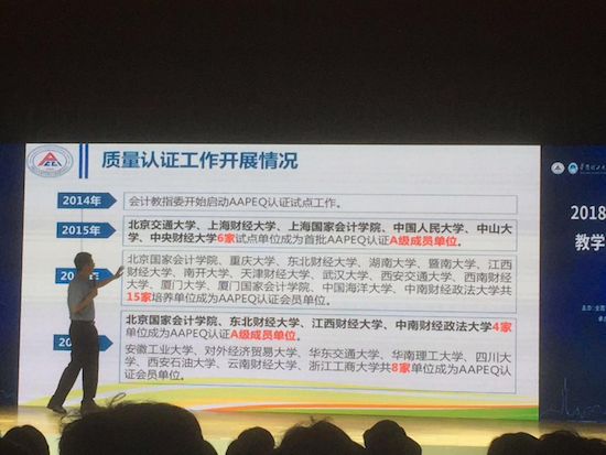 首先,全国会计专业学位研究生教育指导委员会秘书长王化成教授简要介绍了我国现阶段MPAcc项目的发展情况,对2017年全国MPAcc教育工作进行了详细的总结,并深入探讨了未来MPAcc教育发展思路。他同时提出,在当今MPAcc培养单位数量快速增加且培养学生的人数初具规模的情况下,各MPAcc培养单位应当致力于提升办学质量,注重改革创新,推进会计硕士专业学位教育改革。随后,来自东北大学的于丽萍教授、北京国家会计学院的贺颖奇教授、东北财经大学的陈艳利教授、江西财经大学的章卫东教授及中南财经政法大学的王昌锐教授分别向与会代表分享了各自院校MPAcc的项目特色和培养经验。会议最后,全国会计专业学位研究生教育指导委员秘书处办公室主任王永研详细解读了《2018年会计硕士专业学位授权点专项评估方案》,以帮助各院校更好地开展专项评估工作,进一步提升MPAcc项目培养质量。同时,会议还为包括北京国家会计学院、东北财经大学会计学院、江西财经大学会计学院、中南财经政法大学会计学院在内的4所新增会计专业学位教育质量认证(AAPEQ)成员单位颁发证书。