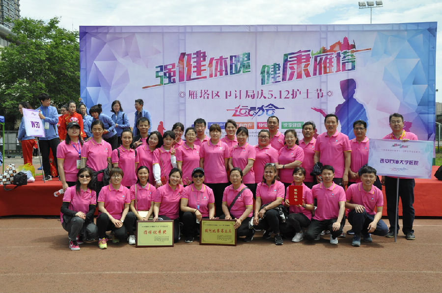 5月11日上午,为庆祝第107个国际护士节,校医院院职工在崔广志院长的带领下参加西安雁塔区卫生与计划生育局举办的庆祝“5.12”护士节运动会。