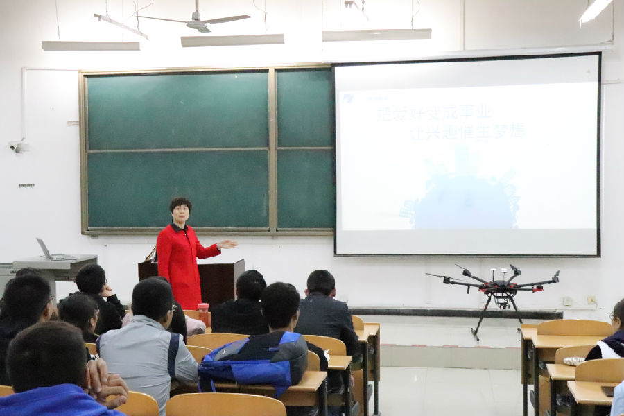 首先,李静老师为同学们讲述了无人机的发展现状和前景,以及它在军事、农业、城市管理等方面的应用;接着,李老师又为同学们讲到了近期大疆五百架无人机的大型表演,场面气势磅礴,给同学们带来了极大的震撼,那么复杂、繁琐的程序操作竟然仅仅只由一个人来完成,让同学们对无人机产生了浓厚的兴趣;最后,李老师通过几个视频使同学们更加深刻地了解到无人机的功能强大,其中涉及到灯展、航拍、调查执法、农业生产等领域。