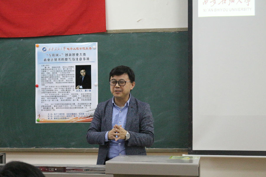 3月8日晚19点,电子工程学院在鄠邑校区C3实验楼419教室成功举办了题为《商业计划书的撰写及注意事项》的专题讲座。此次讲座邀请到高级经济师、山水智慧企业管理咨询有限公司CEO董小泰老师担任主讲。电子工程学院党委副书记黄建礼、2016级辅导员梁琦、青年教师颜谨等指导老师以及申报“互联网+”创新创业项目的同学参加此次专题讲座。