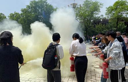 随后,保卫处副处长袁坤向全体参训人员详细讲解灭火器材种类、使用方法等消防安全知识,并进行现场灭火示范操作。参训师生根据动作要领完成灭火器灭火实操演练。