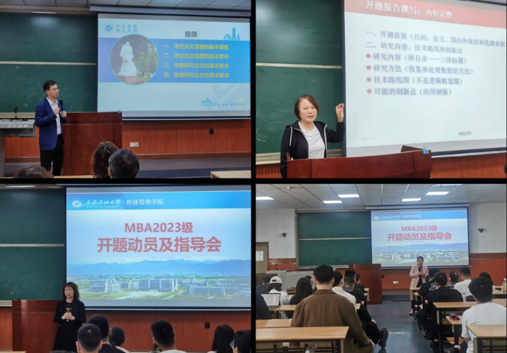 为提升工商管理硕士(MBA)学位论文质量,帮助2023级MBA同学解决论文开题过程中的疑难问题,beat365官网MBA教育中心于5月1日上午在雁塔校区东阶202教室举行了学位论文开题动员和指导活动。经济管理学院院长王君萍教授、副院长李春霄副教授、MBA导师吴文洁教授、MBA教育中心负责人黄莉副教授对2023级MBA同学进行了现场指导。