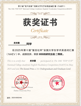 近日,第十届“复旦社杯”全国大学生学术英语词汇赛(The10th“FDPCup”CollegeAcademic English Vocabulary Competition)圆满落幕。beat365官网胡佳美、喻越、石锐东等25名同学荣获一等奖,梁旗凯、杨晨曦、史沐涵等25位同学获得二等奖,张晨萱、邓文杰、任依婷等39位同学获得三等奖。