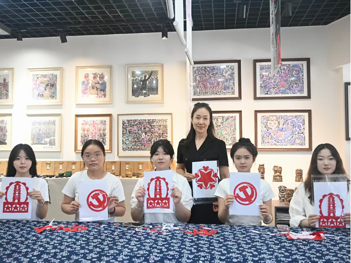实践团队首站赴信天游民间艺术展览馆开展实地调研,系统深入地学习了国家级非物质文化遗产"延安剪纸"及其衍生艺术形式熏画、剪纸画的历史渊源与发展脉络。团队成员与非遗传承人张宁进行了深入交流访谈,并在其悉心指导下开展了剪纸技法实操训练,切身感受了剪刀与红纸间所蕴含的文化韵律。此次实践活动得到了延安市当地媒体的关注,通过媒体传播不仅有效提升了非物质文化遗产的时代影响力,更引发了社会各界对传统文化创造性转化、创新性发展的深入思考——当千年剪纸纹样与革命圣地精神深度融合,中华文明的根脉与红色文化的精神脉络在剪纸艺术中实现了有机统一与创新发展。