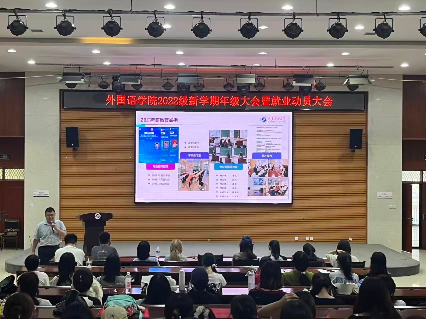 为贯彻落实学校工作要求,引导毕业生树立正确就业观念,提高就业积极性和主动性,助力毕业生顺利求职升学,9月1日,外国语学院在崇文楼108室召开2026届毕业生就业动员大会。外国语学院党委副书记、毕业班辅导员、学院毕业生近200人参加会议。会议由院团委书记陈浩主持。