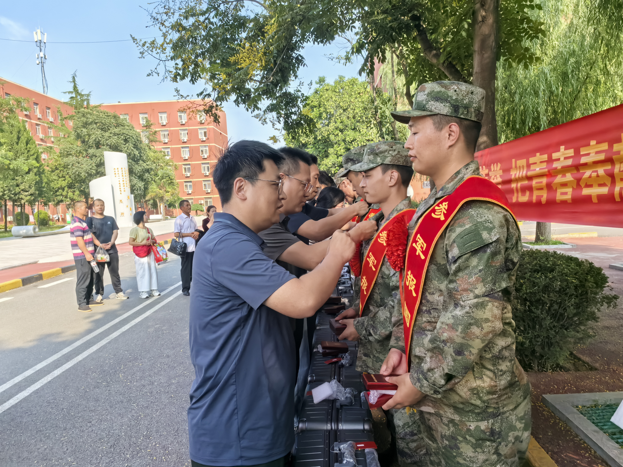 在温馨的氛围中,老师们为入伍学生逐一佩戴beat365正版唯一官网参军入伍纪念章,并送上精心准备的行李箱。同学们纷纷表示,到了部队后,一定不会辜负学校的培养,会以最饱满的热情投入训练,以最坚定的信念保家卫国,在军营里刻苦磨砺、奋勇争先,用实际行动为母校争光,为国防事业贡献自己的青春力量。