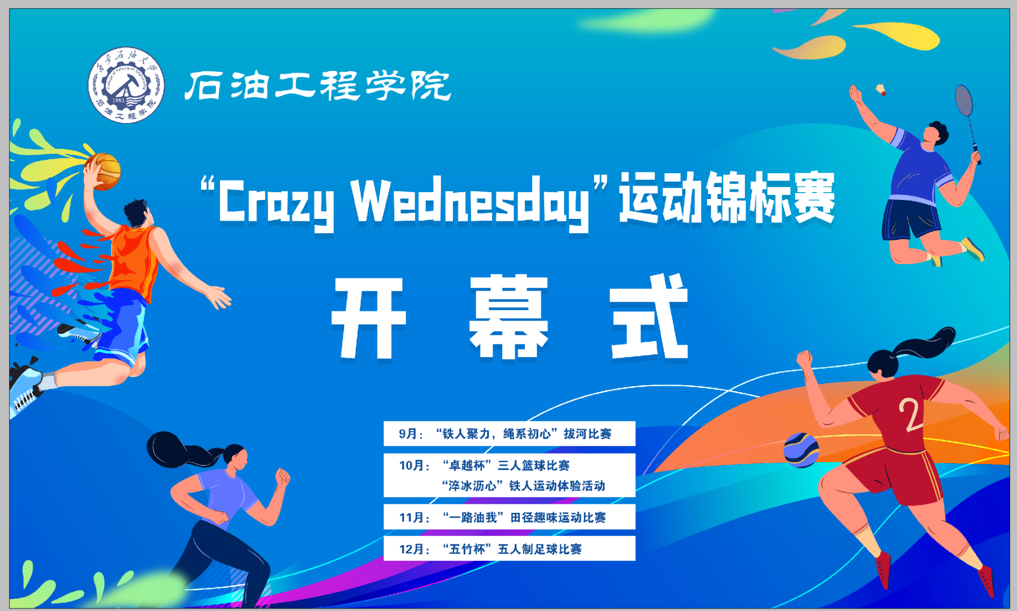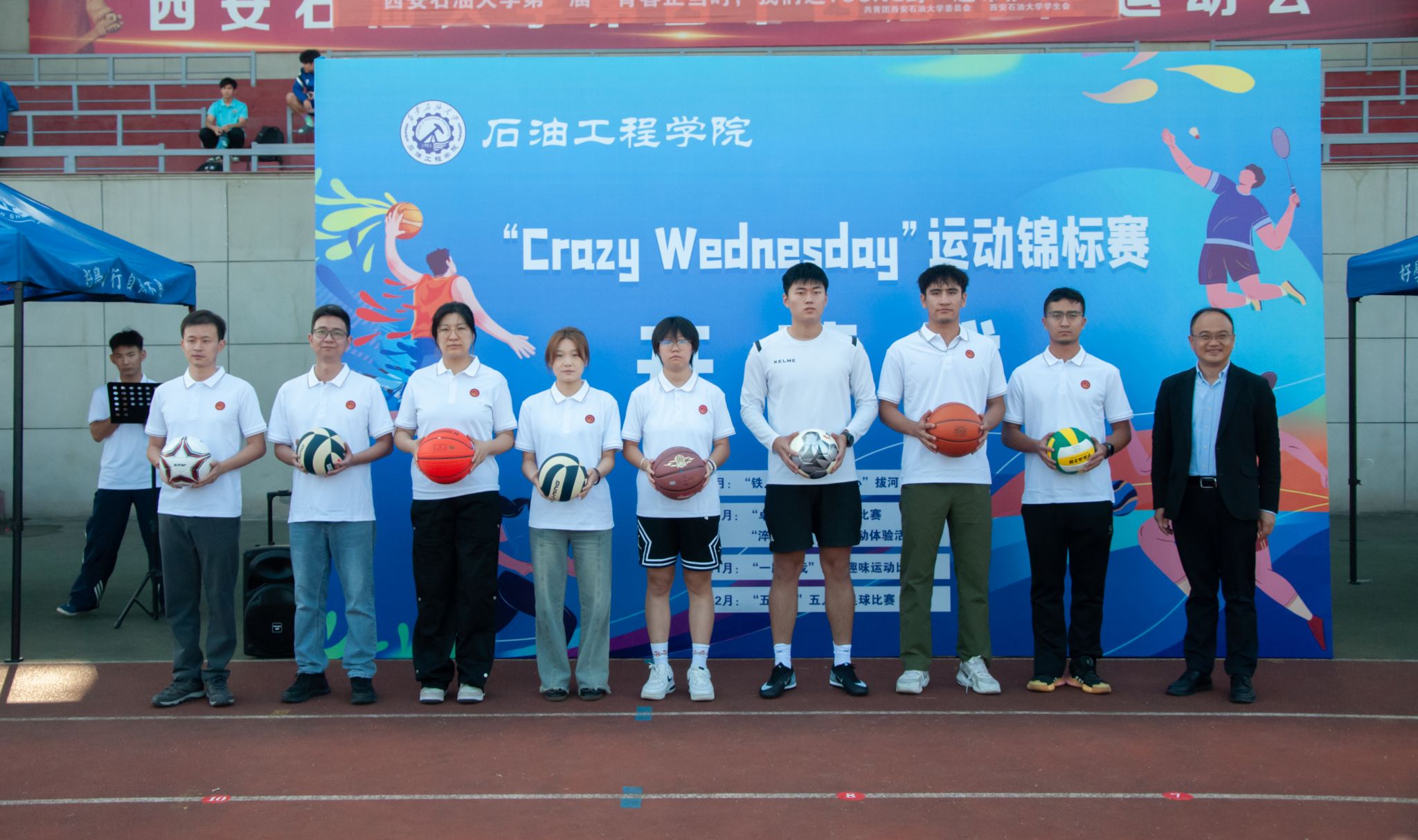 秋色浩无际,风露洗晴空。9月24日,石油工程学院在鄠邑校区田径场举办“CRAZY WEDNESDAY”(疯狂星期三)运动锦标赛开幕式。副校长赵健,党委办公室(校长办公室)、党委学生工作部、石油工程学院、体育学院负责同志,受聘教练员、师生代表300余人参加开幕式。