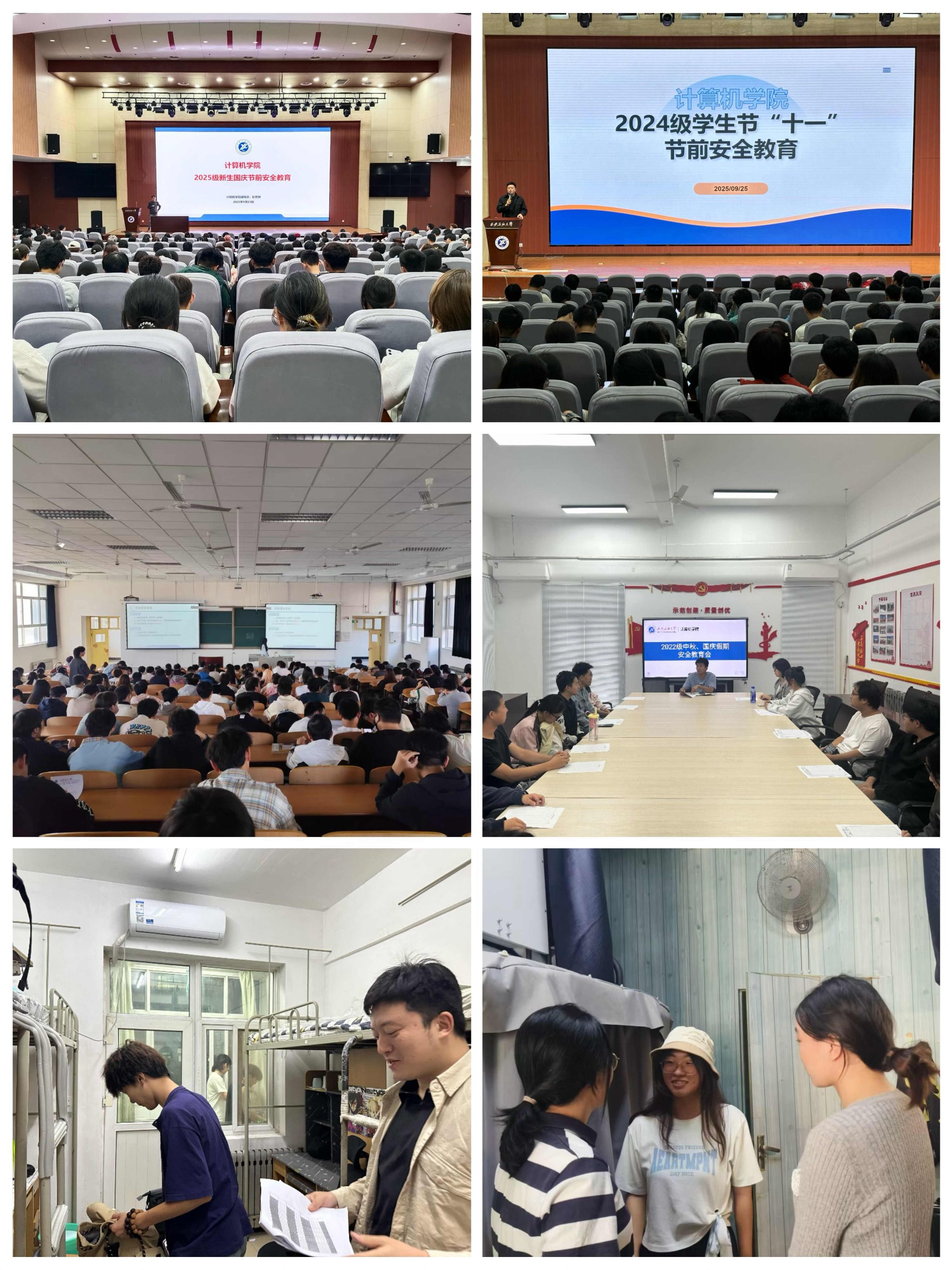全体辅导员通过召开各年级大会、主题班会、深入宿舍、谈心谈话及家校联系等多种途径,教育内容紧密结合学生实际,重点围绕交通安全、宿舍安全、网络安全、出游安全及防范电信诈骗等关键领域展开,通过案例剖析与知识讲解,落实安全教育全覆盖。并针对十一小长假,全面贯彻落实学校相关工作要求,有效提升了学生的安全防范意识和自我防护能力。