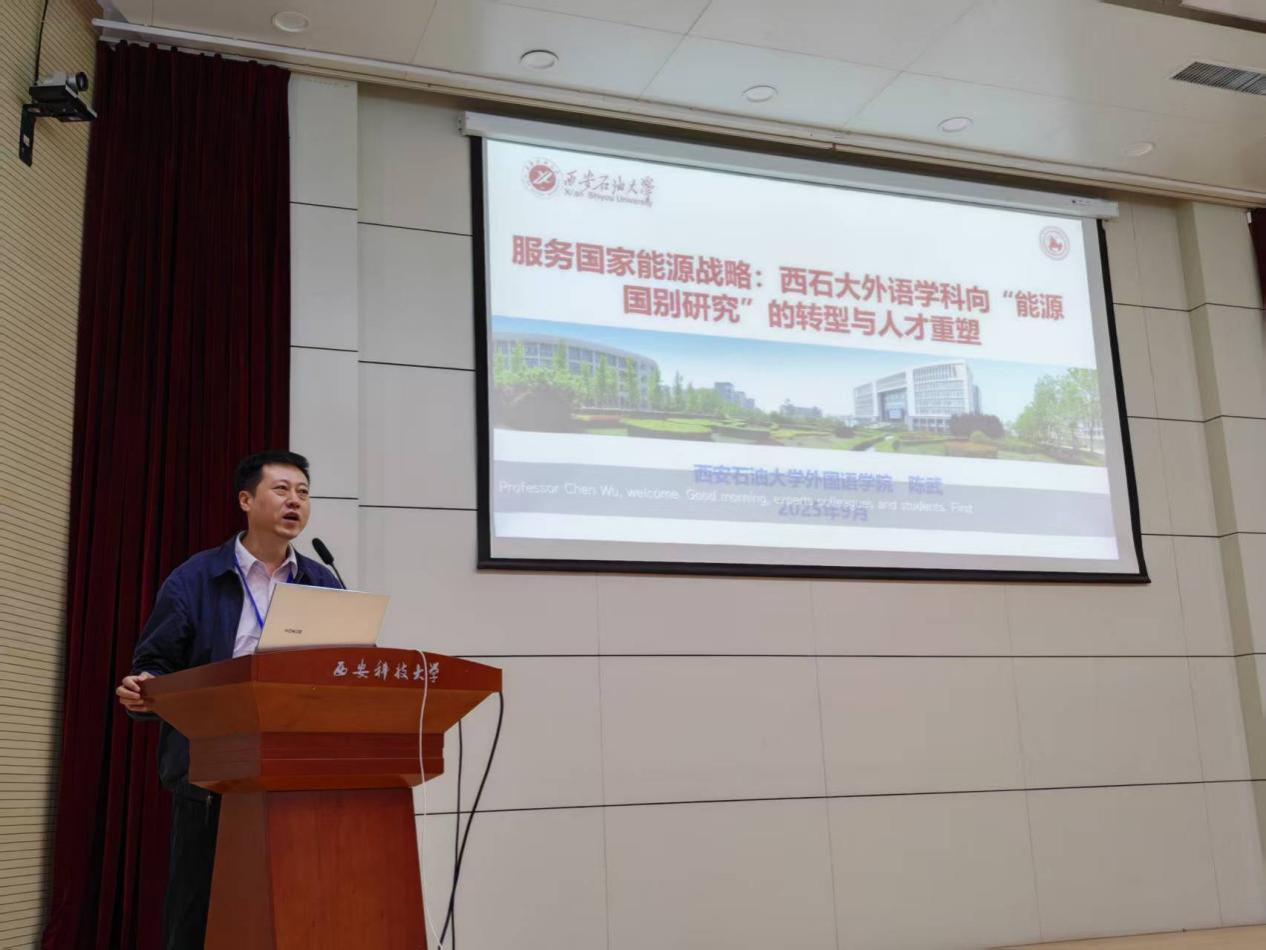 近日,2025欧亚经济论坛框架下的首届区域国别学科教育成果交流会在西安科技大学雁塔校区成功举办。beat365官网外国语学院陈武教授受邀出席会议,并作了题为《服务国家能源战略:西石大外语学科向“能源国别研究”的转型与人才重塑》的主旨报告。