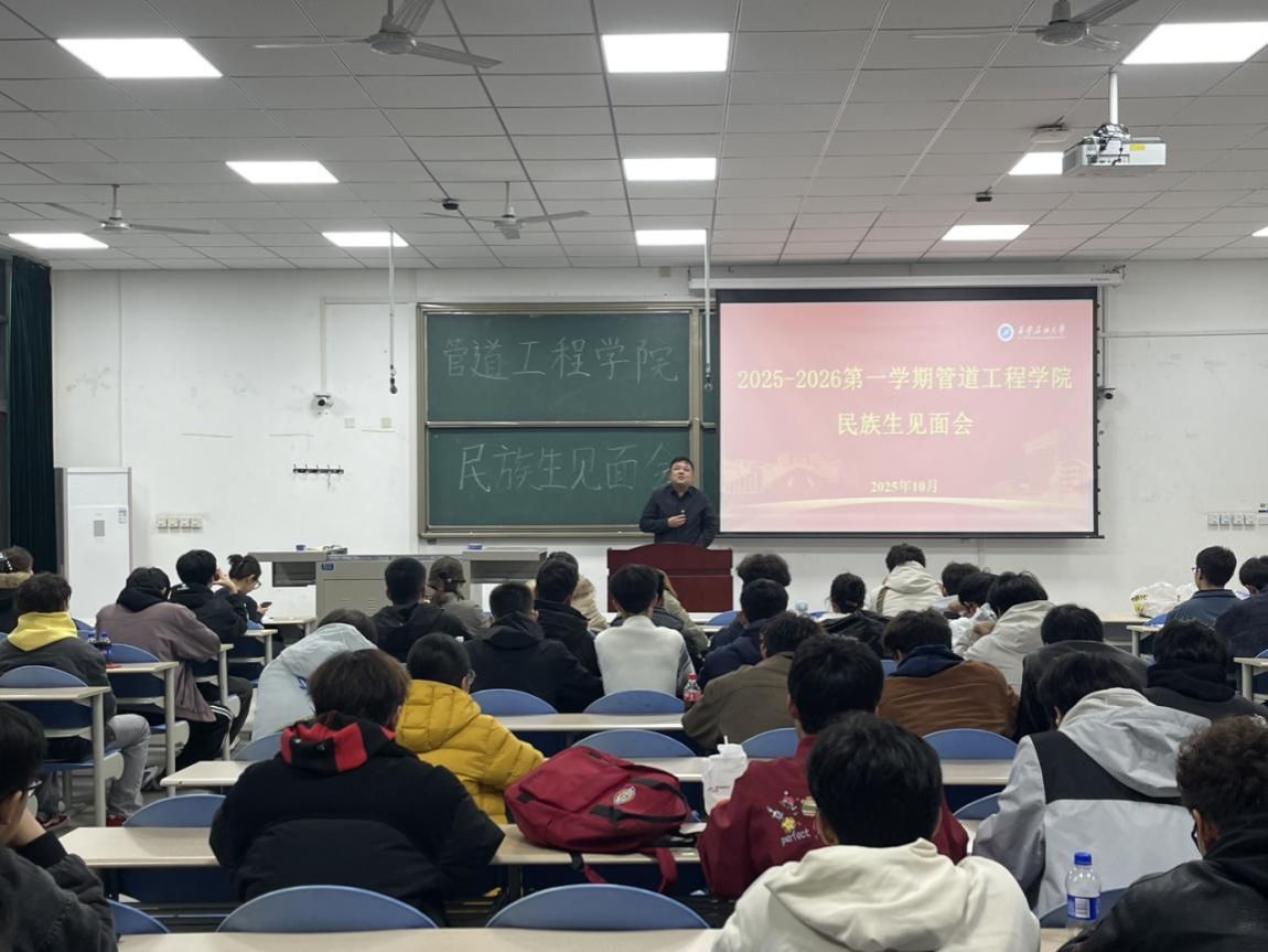 为铸牢中华民族共同体意识,提升少数民族学生工作成效,10月22日晚,管道工程学院在鄠邑校区博思楼B105举行了2025-2026学年第一学期少数民族生交流会。学院党委副书记高亮、2022级辅导员奴丽艳木·夏甫开提、全院117位来自维吾尔族、藏族、回族等多个民族的学生参加交流会。