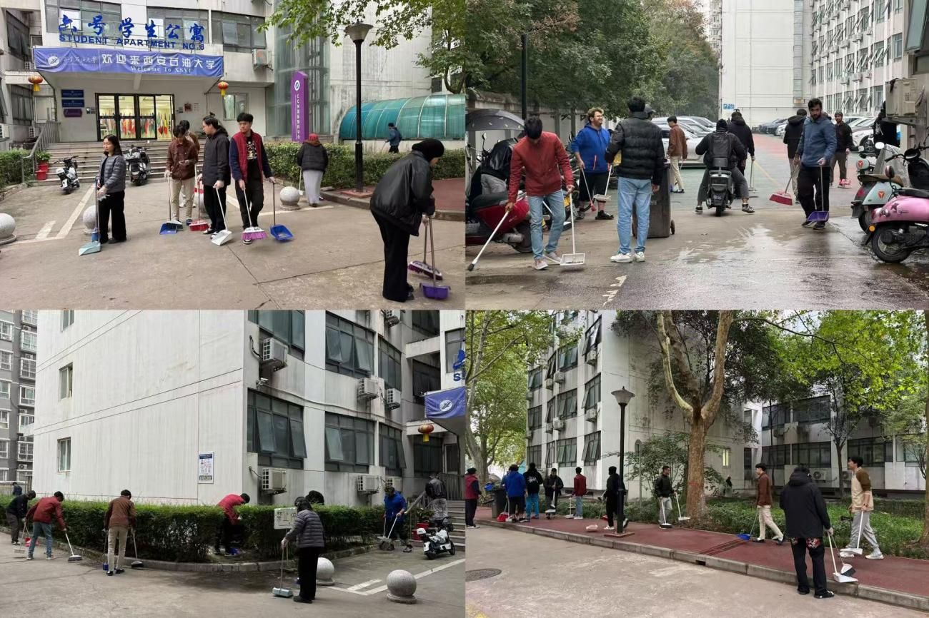 随后,学生分组积极投入劳动,清理国际学生公寓楼及周边停车场、绿化带等区域:楼内细致擦拭楼梯扶手、清理公共厨房杂物;楼外清扫废纸烟头、俯身捡拾草坪零星垃圾。学生们干劲十足,在协作中提升劳动技能、增进友谊,纷纷表示亲手美化“家园”,既让居住环境焕然一新,更增强了学在校园、住在校园归属感与责任感。