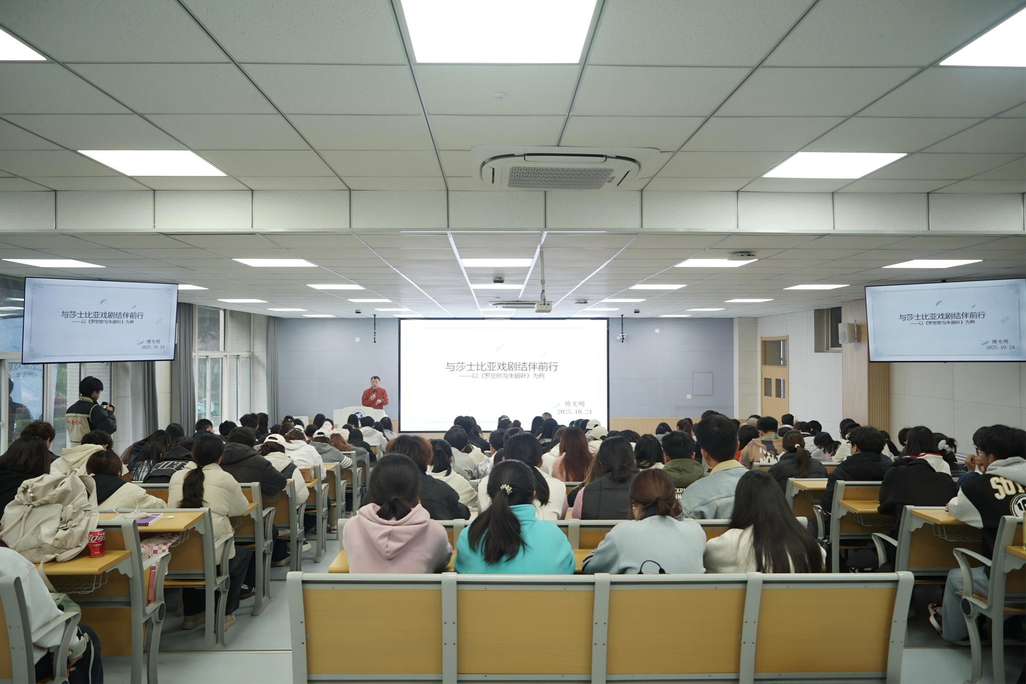 傅光明教授以其深厚的学术功底和诙谐幽默的语言风格,引领同学们步入莎士比亚戏剧的瑰丽殿堂。在讲解《哈姆雷特》时,他通过对比“To be, or not to be”这一经典独白的不同译本,深入剖析了译者如何理解与传递莎翁笔下的终极哲思;而当聚焦《罗密欧与朱丽叶》,他又将目光投向诗意盎然的对白转译,生动诠释了这段爱情传奇在跨越语言屏障时所迸发的艺术张力。他深情回顾了自己与莎士比亚戏剧数十载的“结伴”之旅,分享了如何通过细读文本、比对版本、考据历史,逐步深入这座文学宝库。他鼓励青年学子在求知的道路上,永葆恒心、锤炼匠心、坚守对真理的赤诚之心。
