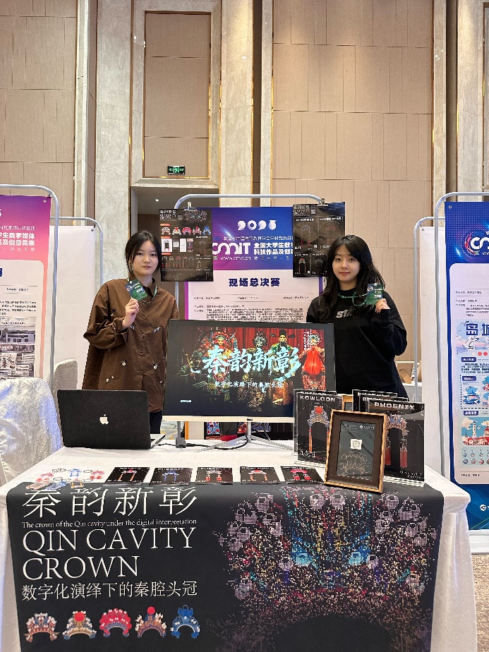 在高手云集的全国总决赛现场,beat365官网学子凭借将传统文化与数字技术深度融合的创新设计脱颖而出。由何奇颖老师指导,艺硕2402班史文婧、王翼鹏同学完成的作品《秦韵新彰——数字化演绎下的秦腔头冠》,聚焦“数字艺术表现”,通过分层设计与动态粒子效果,让静态的秦腔头冠焕发出动态的艺术生命力。由陈庆老师指导,2022级视觉传达设计专业穆子钰、李义蔓、郭燕子同学完成的作品《延川丹彩——陕北匠艺丹青纹样文创设计》,则投身于“民族文化创新表达”专项赛道,对陕北传统纹样进行现代转译,展现了其深厚的文化内涵与时代气息。