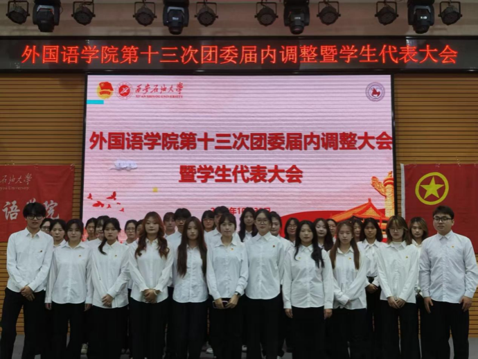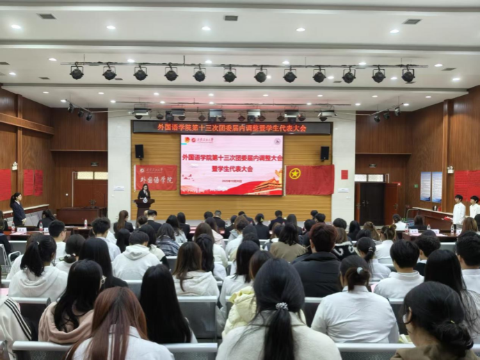 10月30日,外国语学院第十三次团委届内调整暨学生代表大会在鄠邑校区崇文楼118多功能厅隆重召开。校团委副书记王军策、外国语学院各年级团总支书记、校学生会执行主席以及各兄弟院(系)学生会负责人,本次大会学生代表共150余人参加。