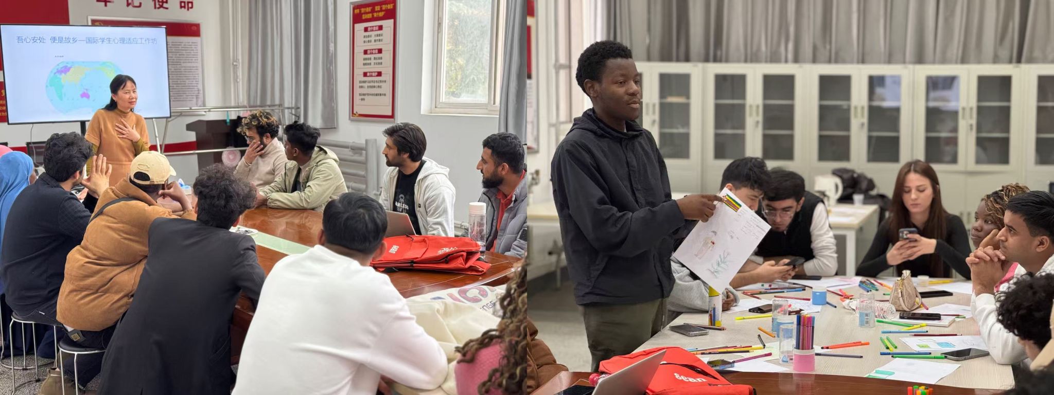 围绕国际学生跨文化适应中的心理需求,第三期 “吾心安处,便是故乡—国际学生心理工作坊”于11月14日在雁塔校区成功开办,辅导员老师与16名国际学生共同参与。活动以中国传统健身气功八段锦开场热身,帮助学生放松身心、快速融入氛围;通过互动分享,引导参与者坦诚交流个人文化背景、在华学习生活经历及遇到的适应难题,以“建立积极心态”“寻求社会支持”“实现自我成长”“共绘发展愿景”为主题进行叙事重构,通过教师专业引导与学生群体互动,帮助国际学生缓解文化冲击带来的心理压力,切实提升跨文化心理适应能力,让学生在校园中感受到家的温暖。