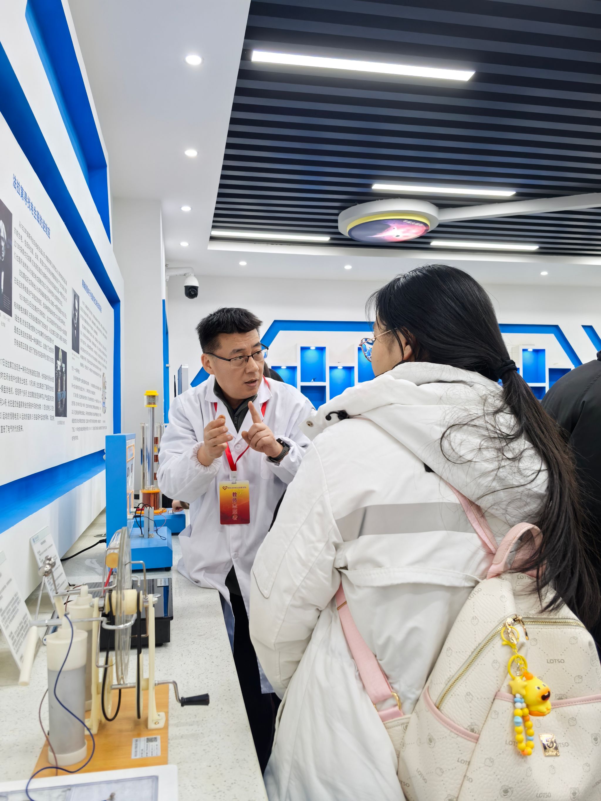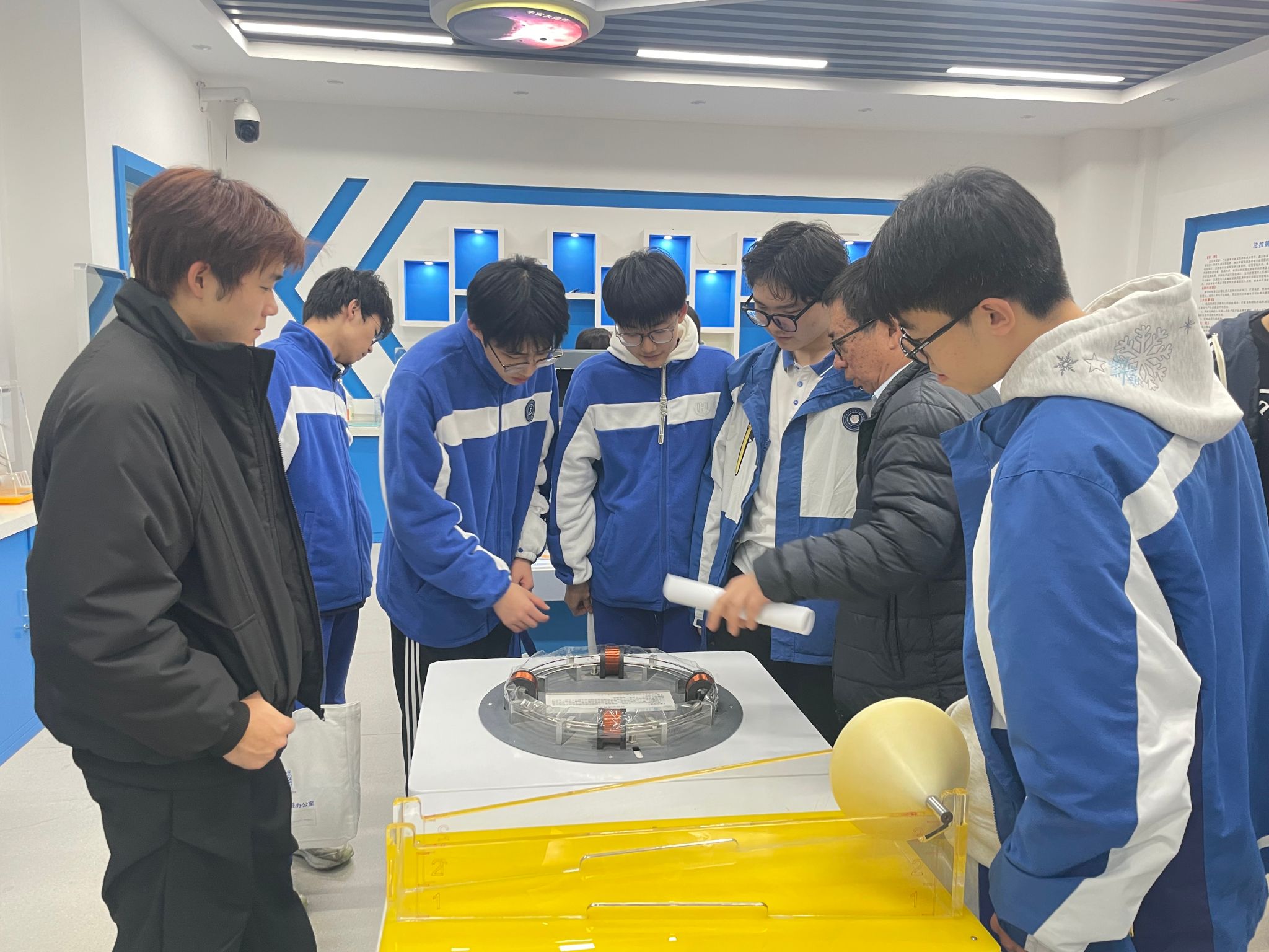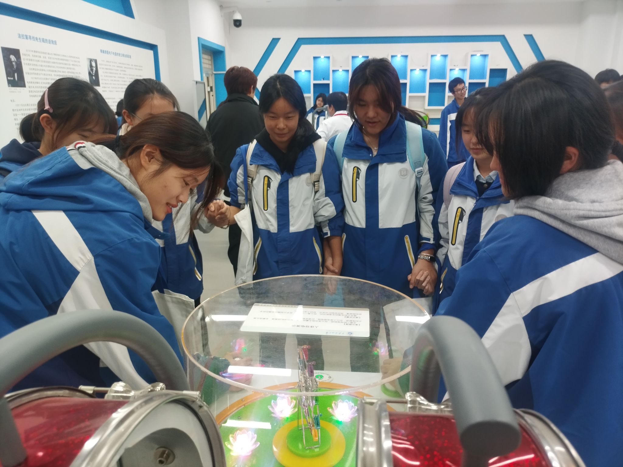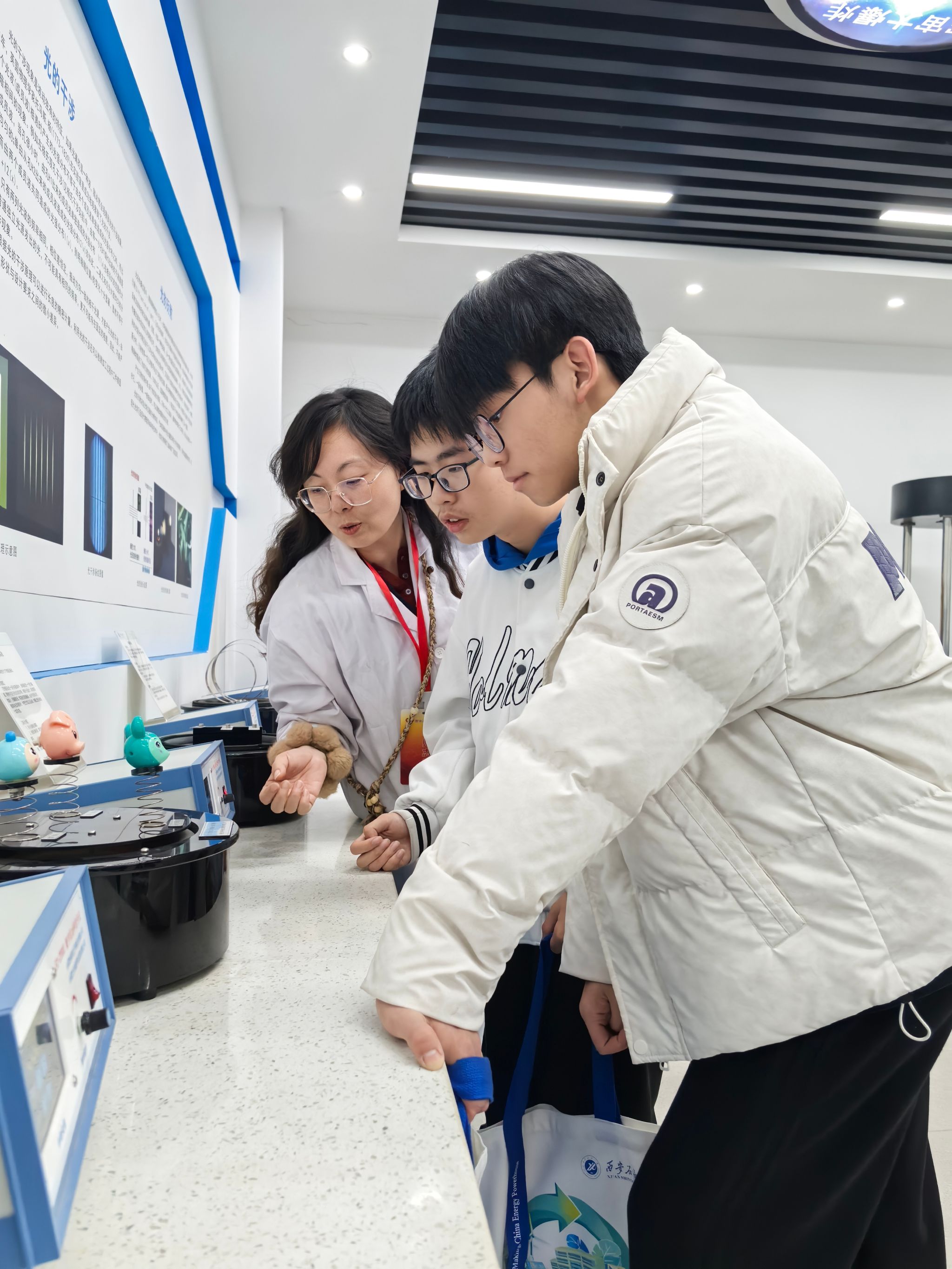 研学活动第二站来到理学院物理演示实验室。物理演示实验室是陕西省科普教育基地,是集图像演示、实物操作等功能为一体的开放性实验室,涵盖了力学、电磁学、光学、热学等方面知识。在理学院师生讲解员的耐心讲解和示范下,同学们依次参观并亲身体验了一系列精彩的物理实验。从灵巧的机械装置,到神奇的电磁感应;从热现象的微观奥秘,到光和影的奇幻世界,每一个实验都让同学们惊叹不已,深深感受到了物理世界的无穷魅力。这些精心设计的演示实验,不仅激发了学生对物理学奥秘的好奇心与探索欲,更为大家搭建起了一座通往科学殿堂的桥梁,让物理之美跃然眼前,深入人心。