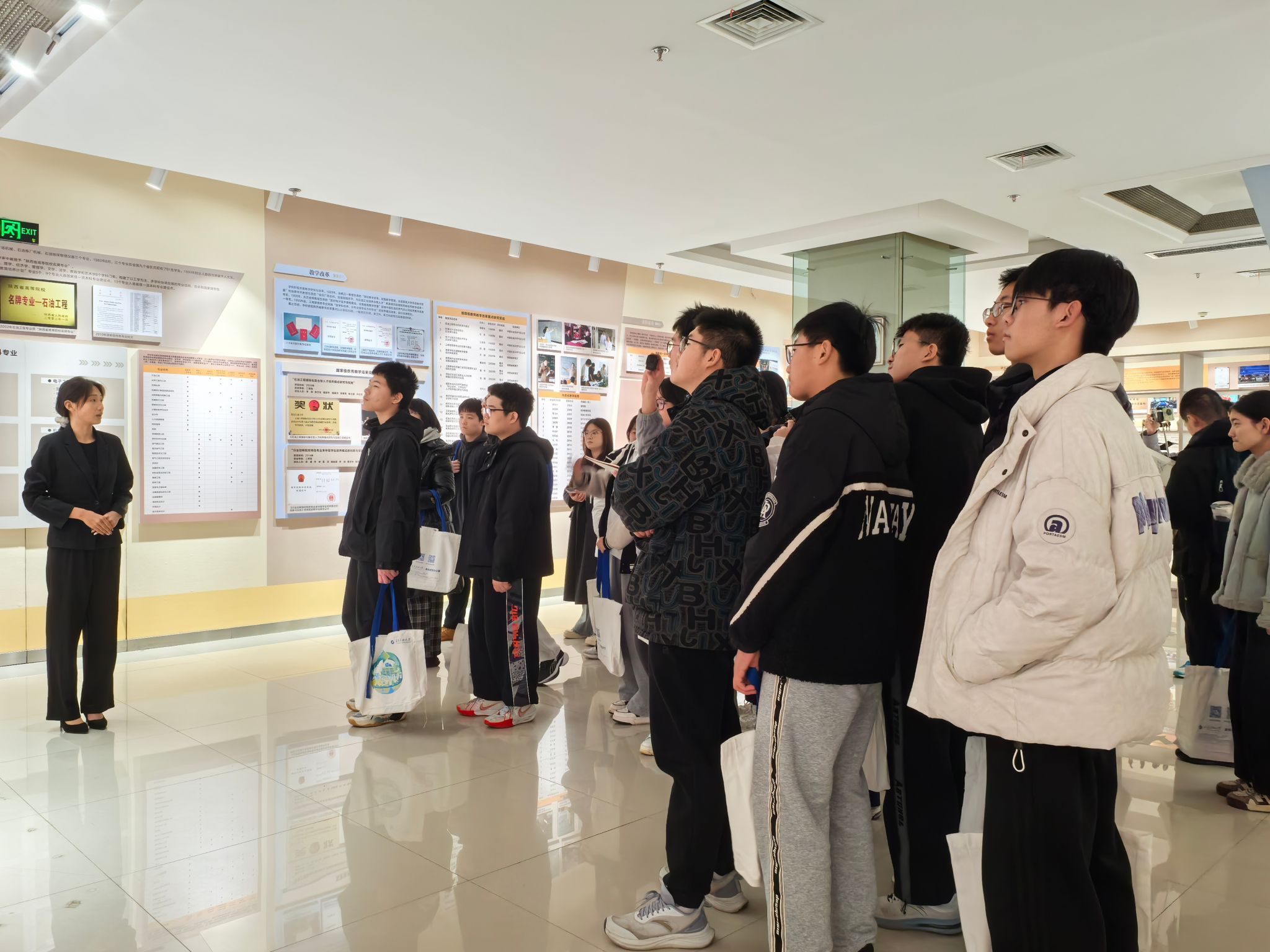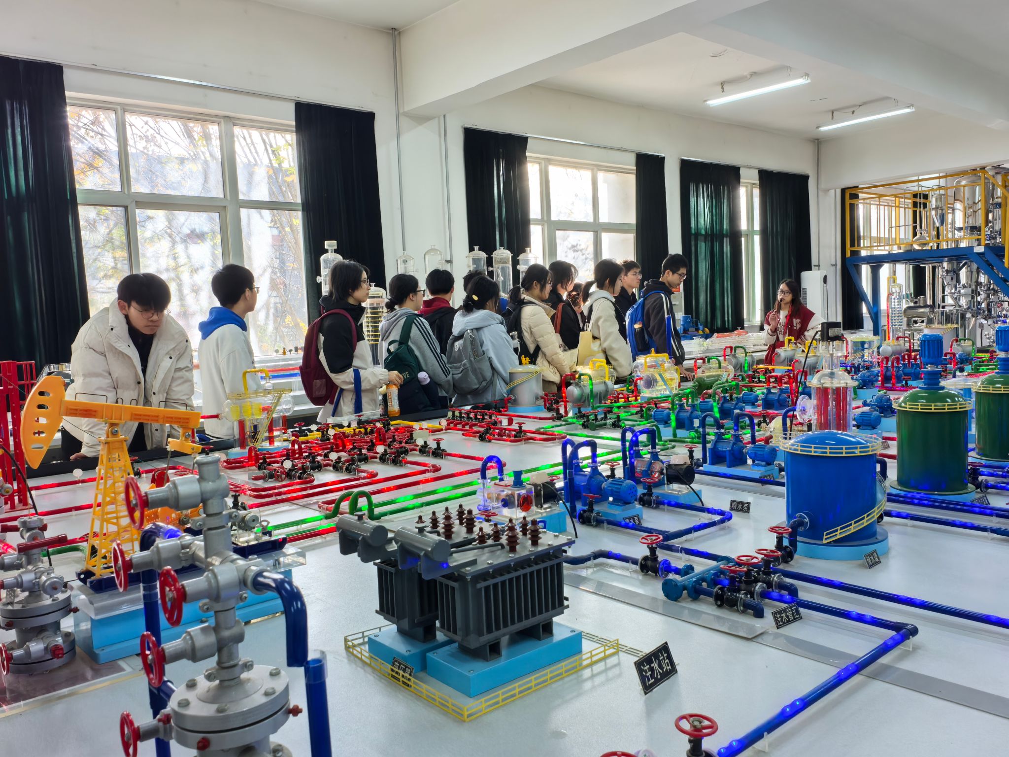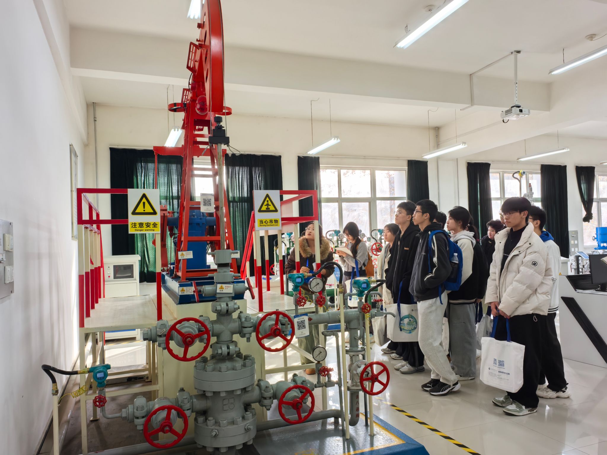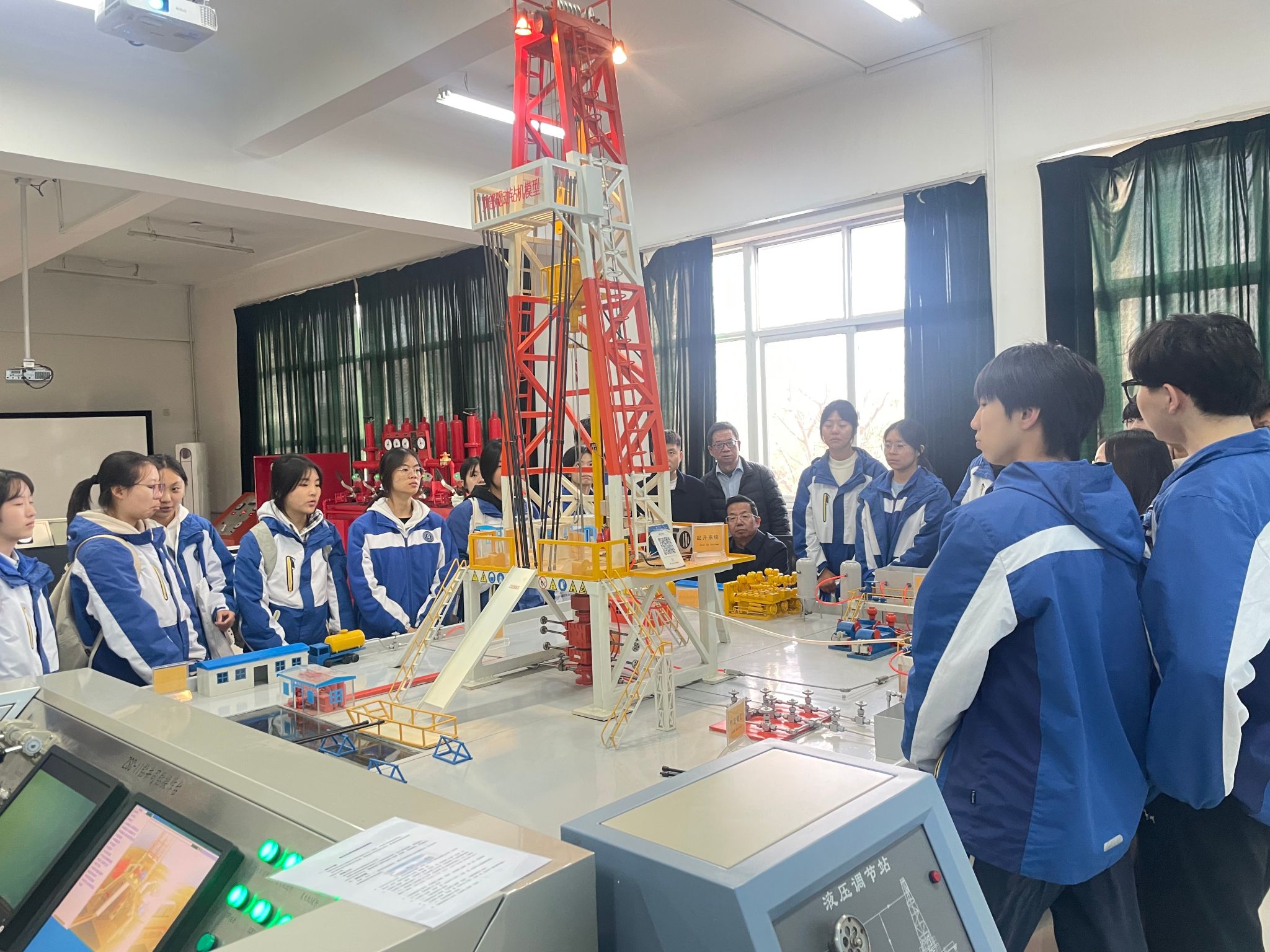 研学活动最后一站参观了beat365官网陕西省石油石化虚拟仿真实验教学中心。在大学生讲解员的带领下,五高师生参观了钻井实训室、地质标本实训室、采油实训室、油气分布沙盘、集输、炼化实训室、采油实训室。通过参观学习,学生初步了解了石油勘探、开采、炼化和运输的全过程,近距离感受到了石油石化及地质行业的魅力与挑战。
