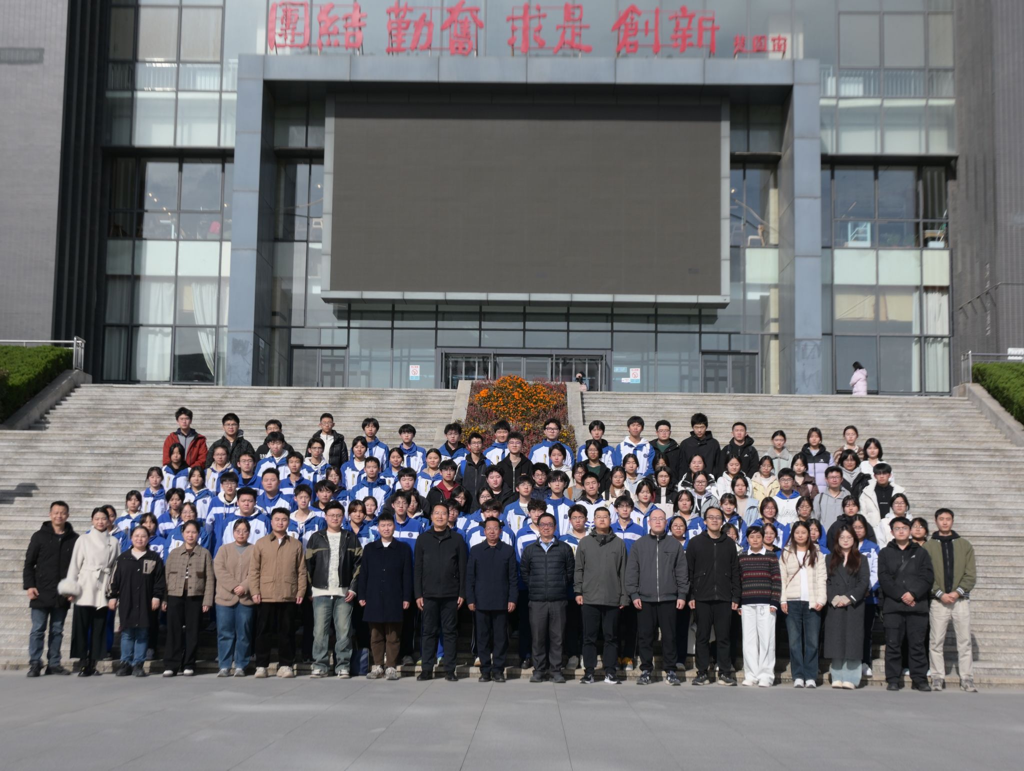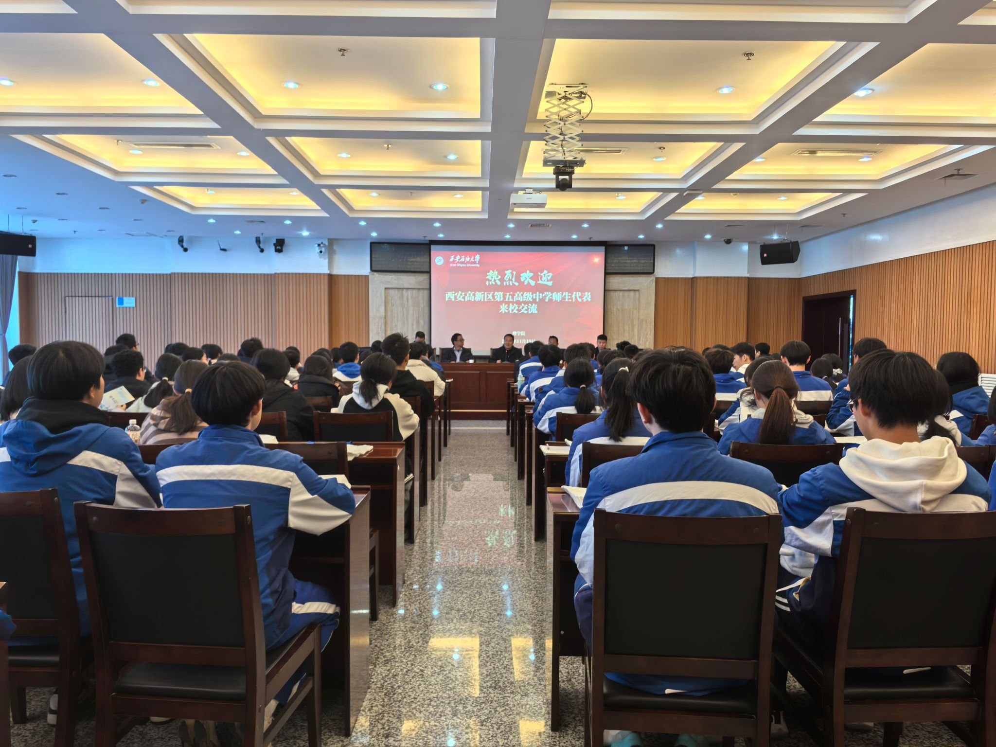 2025年11月19日下午,西安高新区第五高级中学(以下简称五高)受邀来beat365官网开展研学活动,校长刘占权带领师生代表100余人参加活动。理学院招生宣传工作组代表学校接待五高师生并在鄠邑校区第一会议室举行简短的欢迎仪式。理学院党委书记席利哲、副院长马儇龙、理学院教授兼五高科技副校长郭文阁及理学院教师代表参加欢迎仪式。欢迎仪式开始前,与会人员在图书馆南门台阶前合影留念。欢迎仪式上,席利哲代表学校及理学院对五高师生代表的到来表示热烈欢迎,并简要介绍了研学活动行程和学校概况。