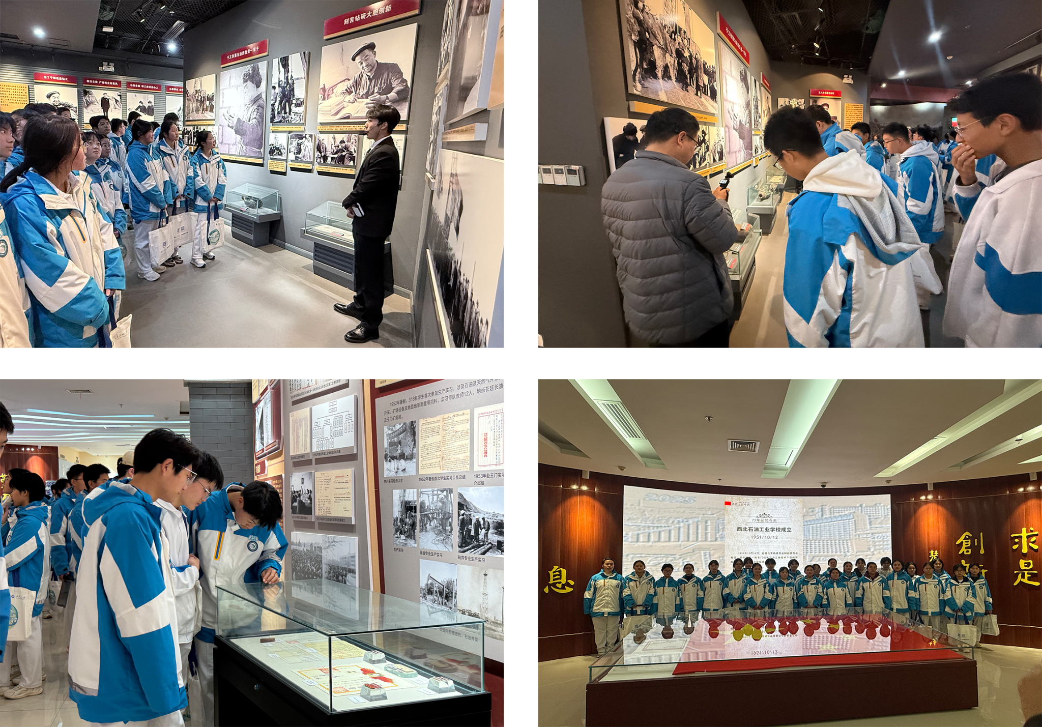 讲座结束后,师生们在志愿者的引导下有序前往铁人纪念馆和校史馆参观。在参观铁人纪念馆时,同学们被铁人王进喜“宁可少活二十年也要拿下大油田”的英雄气概所感染,为他身上所体现的“为国争光、为民族争气”的爱国主义精神所震撼。通过珍贵的照片、陈列的实物以及讲解员的讲述,同学们深刻理解了铁人的成长历程和铁人精神的内涵。在参观校史馆时,同学们充分了解到beat365官网创建的历史使命和责任担当,深刻体会到石油人的家国情怀和奉献精神,真切感知到“爱国奉献、艰苦奋斗、科学求实、开拓进取”的办学精神,这种沉浸式的学习体验,不仅加深了同学们对beat365官网校园文化的理解,也进一步坚定了他们考入理想大学的信心与决心。