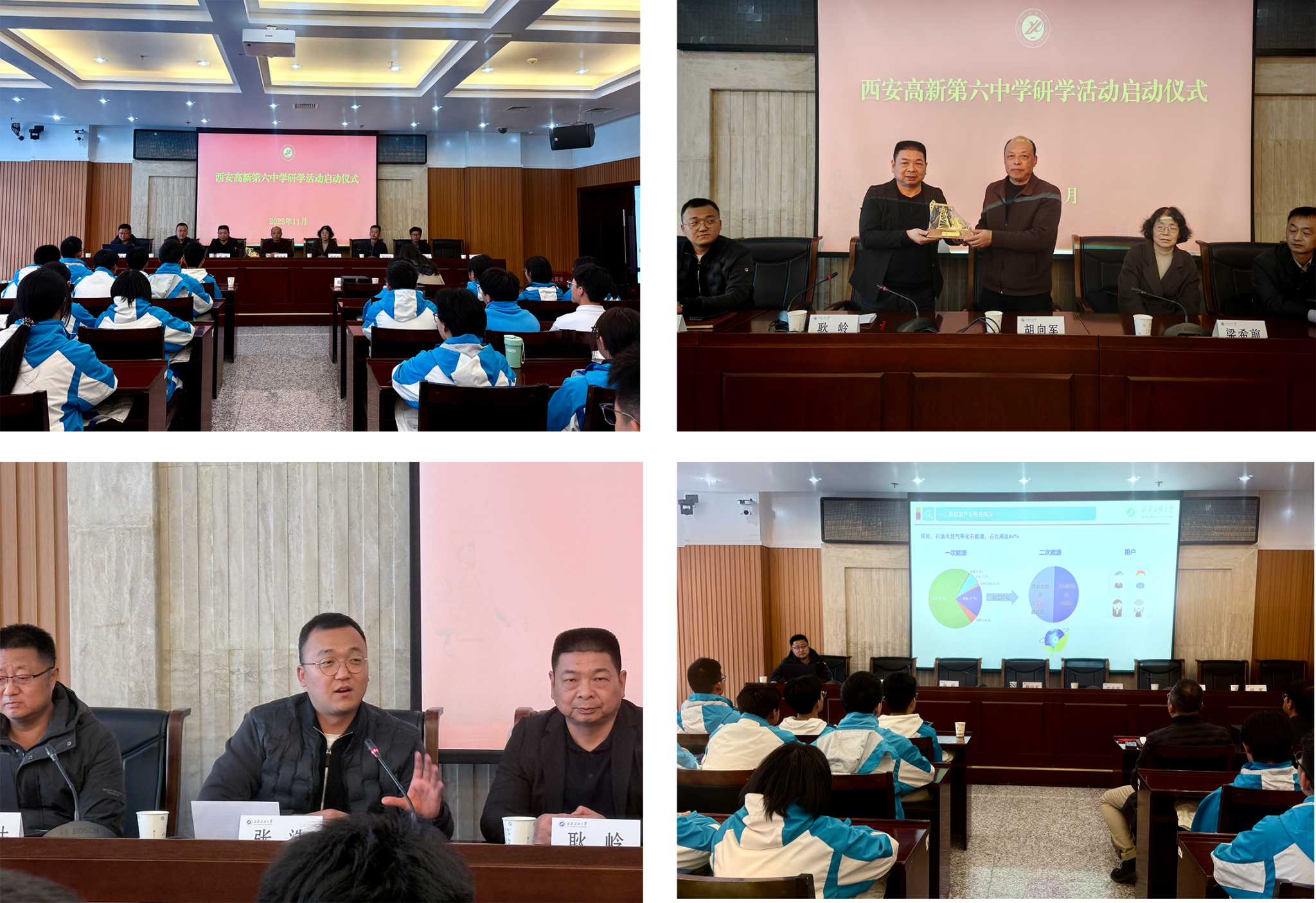 启动仪式上,耿岭代表学校对高新区第六高级中学师生代表的到来表示热烈欢迎,并详细介绍了学校的历史沿革、专业特色和教学科研等方面的情况。他希望同学们通过近距离体验大学生活,感知科研的严谨与魅力,体悟“为国找油,为民族争气”的崇高使命,将所见所闻内化为学习的强劲动力,坚定目标,脚踏实地,努力成长为建设国家的栋梁之才。接着,耿岭代表学校向中学赠送了抽油机模型,寄托了两校友谊长存、共育英才的美好期望。随后,张浩介绍了学校的招生政策和本次研学活动的具体安排。启动仪式结束后,雒设计为高中同学们带来了题为《驭光氢之“能”定国器之“材”》的科普讲座,围绕为什么发展氢能、氢能的内涵、发展现状以及广阔前景四个方面,系统阐释了氢能的前世今生与未来趋势。