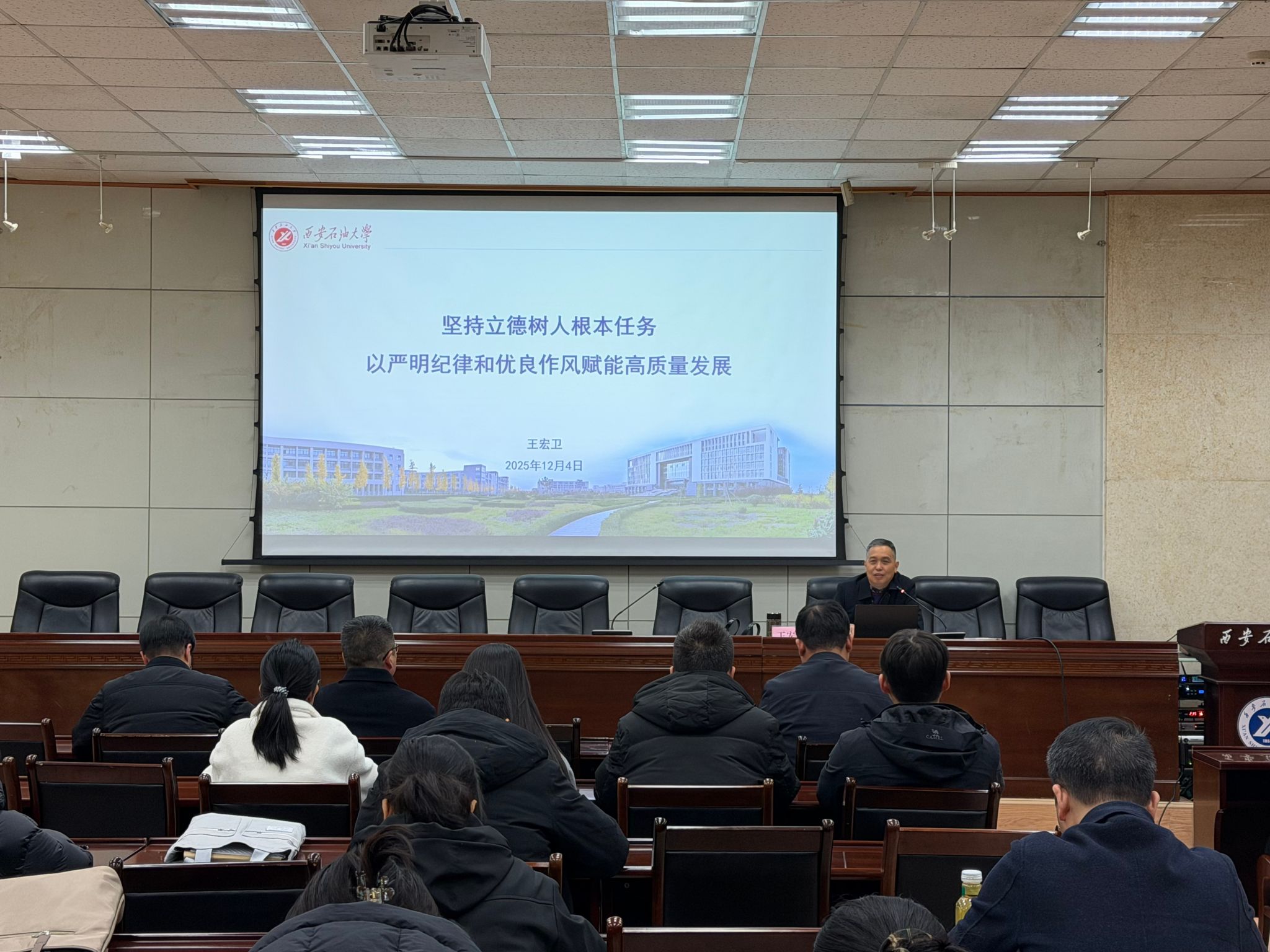 12月4日下午,管道工程学院党委在雁塔校区西阶第三会议室开展了“学党章铸忠诚,悟思想强使命”专题学习班第二讲。本次课程由校纪委副书记王宏卫讲授,主题为“坚持立德树人根本任务,以严明纪律和优良作风赋能高质量发展”,学院全体教职工、研究生党员代表共70余人参加学习。会议由学院党委副书记高亮主持。