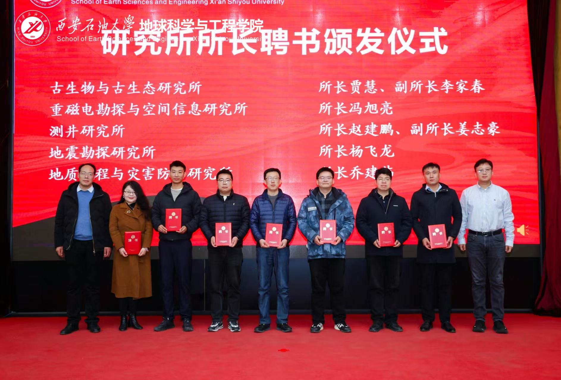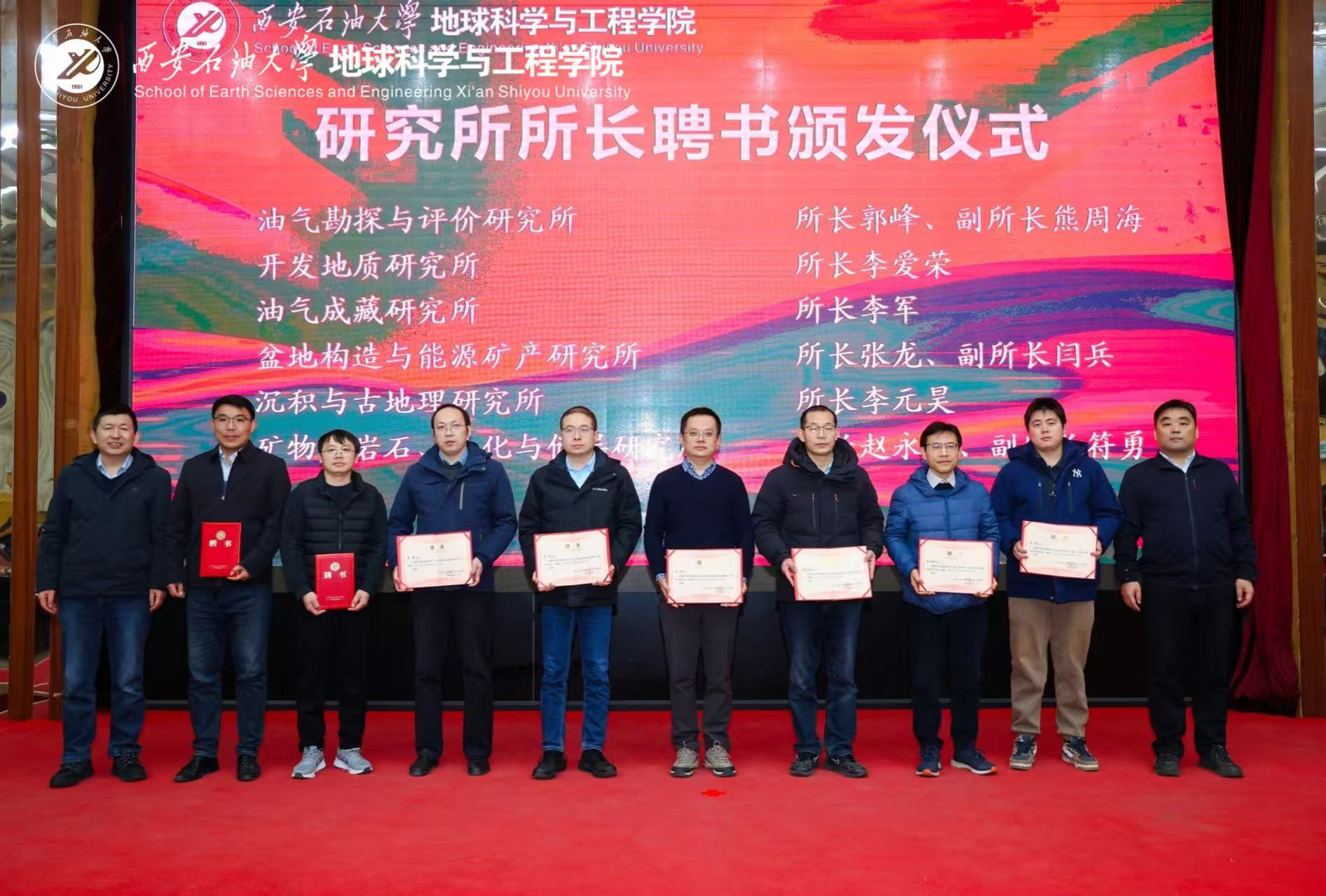 学院院长宋立军宣读了学院新一届研究所所长聘任决定,学院领导分批为新组建的油气地质研究所、沉积与古地理研究所等11个研究所的15位新任所长颁发了聘书。