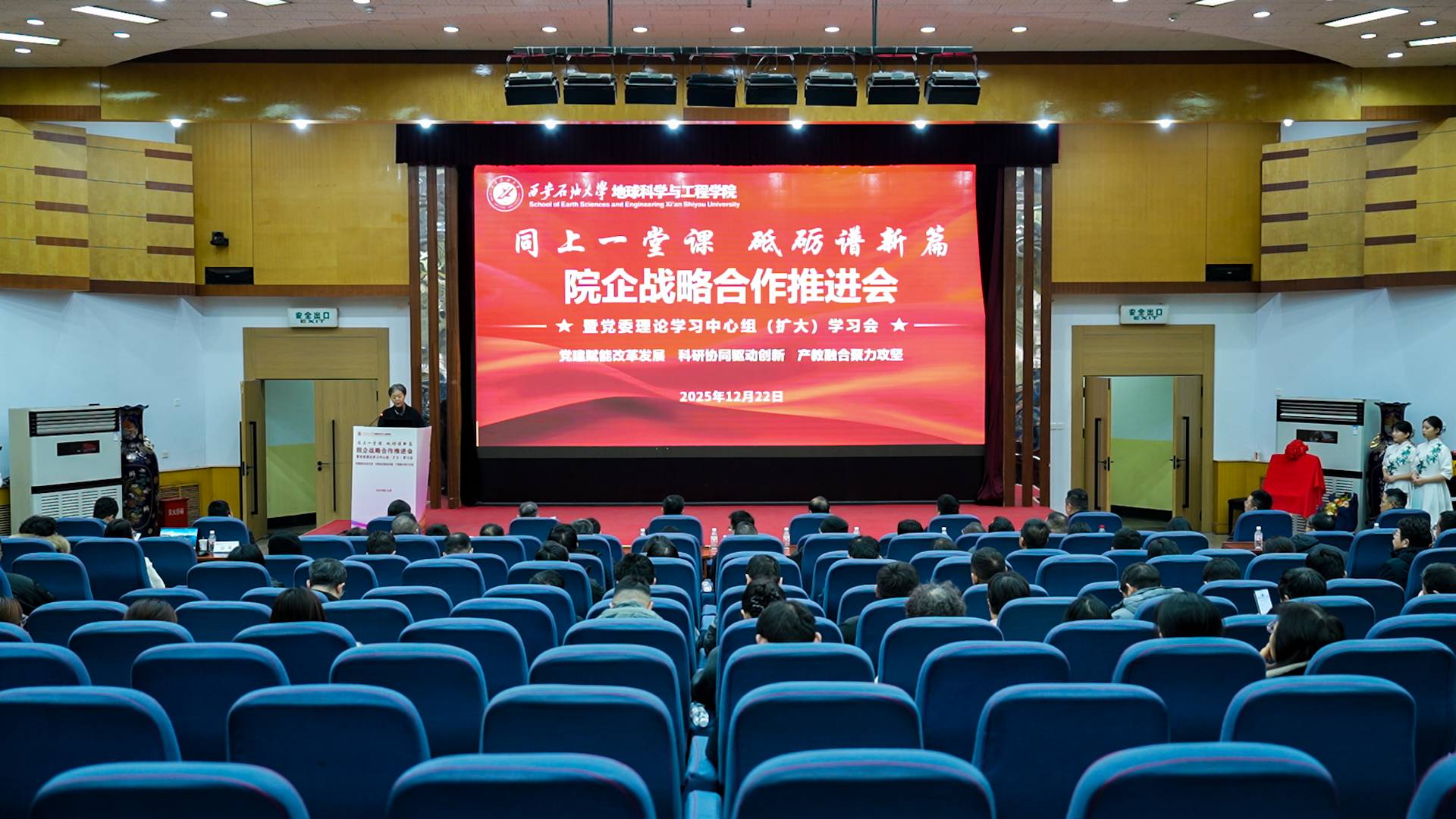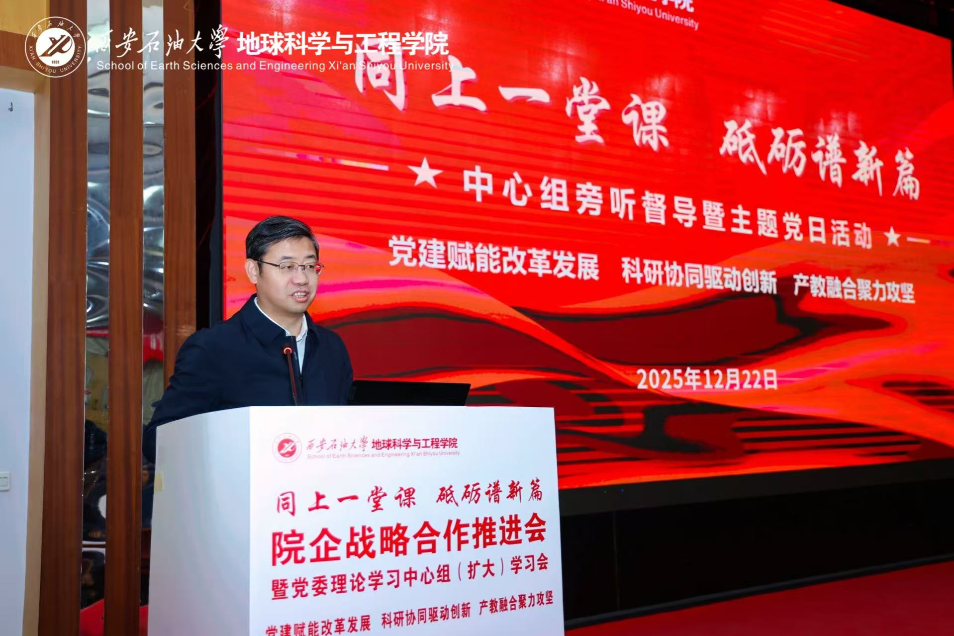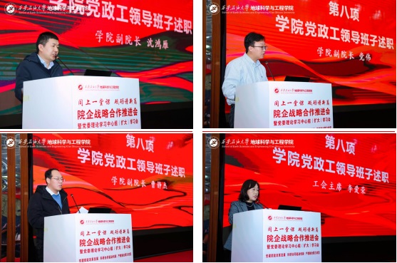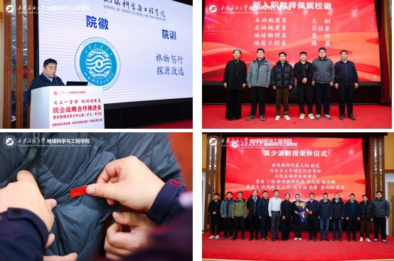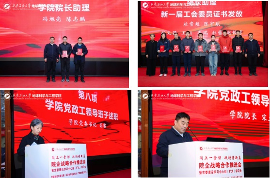 为贯彻落实学校“三个年”建设部署,深化“院所制”改革,12月22日,地球科学与工程学院“同上一堂课 砥砺谱新篇”院企战略合作推进会暨党委理论学习中心组(扩大)学习会在雁塔校区举行。会议以“党建赋能改革发展,科研协同驱动创新,产教融合聚力攻坚”为主线,通过联合研究院揭牌、前沿学术报告、专题思政课与学院内部建设系列议程,汇聚发展共识,擘画未来蓝图。校长王进富,长庆油田首席技术专家喻健,西安石文软件有限公司董事长、总经理张小会,副总经理杨静波,校友工作与合作交流处相关负责人等校企嘉宾及全院师生代表共同参会。学院党委书记高黎主持会议。