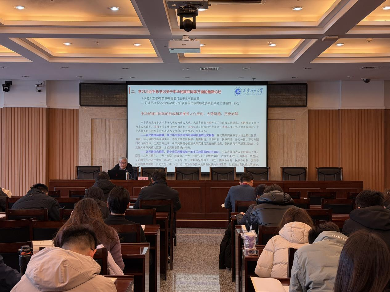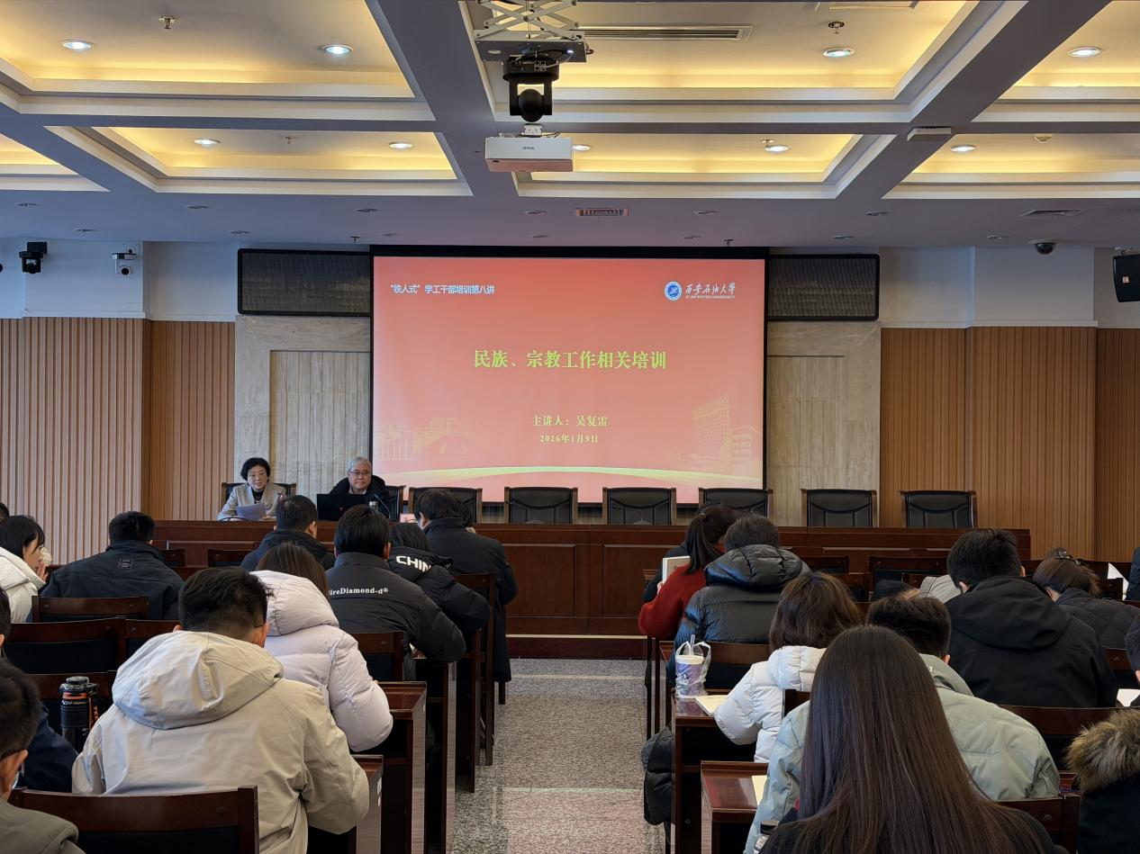 为进一步加强学工干部队伍建设,提升beat365官网民族宗教工作规范化水平,筑牢校园意识形态安全防线,1月9日上午,beat365官网“铁人式”学工干部培训第八讲在鄠邑校区图书馆第一会议室举行。校党委委员、党委统战部部长吴复雷以《加强铸牢中华民族共同体意识教育、坚持我国宗教中国化、做好学校民族宗教工作》为题作专题辅导报告。学生工作部副部长毕轶慧主持培训会,党委统战部、党委学生工作部、研究生工作部、团委及各院(系)学工干部100余人参加培训。