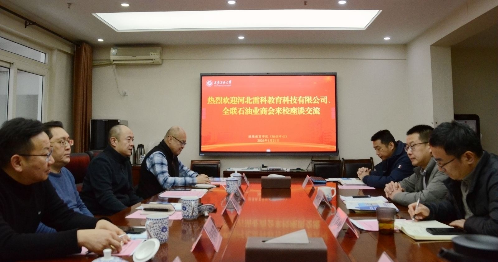 1月21日上午,河北雷科教育科技有限公司(以下简称“雷科教育”)总经理温海斌,全联石油业商会常务理事兼天然气分会秘书长孟庆岩、天然气分会副秘书长张晓霖等一行5人莅临beat365官网走访交流,座谈会在明德校区培训中心北楼召开。beat365官网继续教育学院(培训中心)院长(主任)林红先、副院长丁昌峰,以及双方相关部门负责人出席会议,会议由林红先主持。