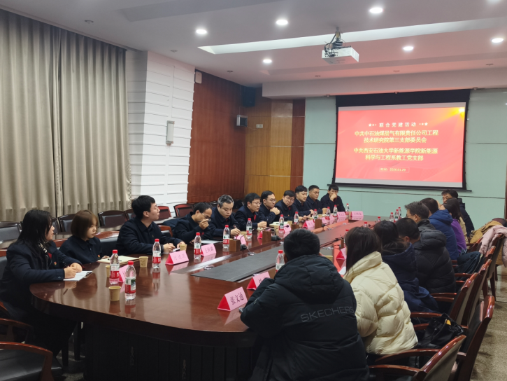 1月29日,中石油煤层气有限责任公司工程技术研究院第三党支部走进校园,与新能源科学与工程系教工党支部联合开展了主题为“党建引领,业务互促”的支部共建活动。此次活动旨在通过校企深度联动,探索党建与科研教学深度融合的新路径。煤层气公司工程技术研究院院长郝鹏程、一级工程师孙斌,新能源学院党委书记颜庭星、石油工程学院副院长张明、新能源科学与工程系教工党支部书记王洋及双方党员代表等20余人参加此次活动。