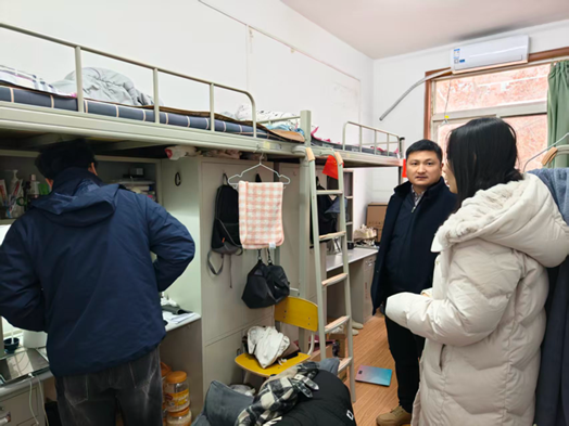 走访前,董丙剑一行还深入实验室,与研究生导师交流留校学生情况。此次走访检查与慰问交流,既全面排查了宿舍安全隐患、强化了学生安全防范意识,也拉近了学院与学生的距离,精准掌握了留校生活与就业求职的真实情况。下一步,学院将持续做好假期留校学生动态管理与日常关怀,常态化开展宿舍安全巡查,建立问题整改闭环机制,同时针对性开展就业指导、岗位推送等服务,全力守护学生安全与成长发展。