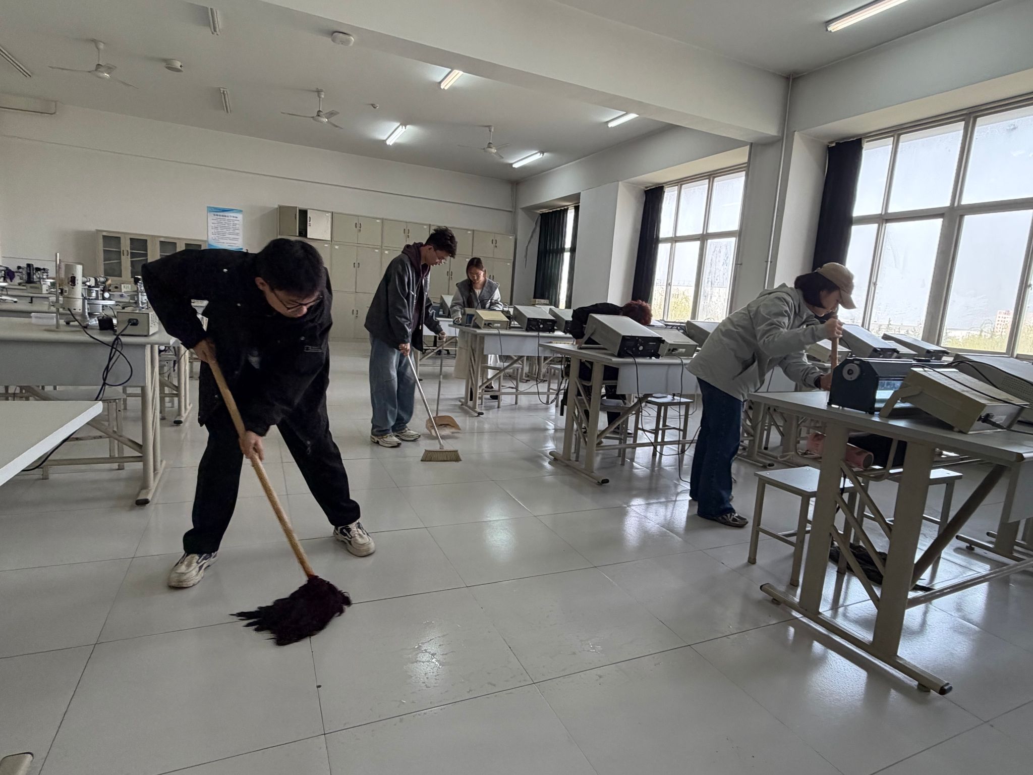志愿者们在学院团委书记庞波老师的统筹安排下分成四个小组,分别奔赴不同的责任区域。在考研自习室,志愿者们仔细擦拭书桌、座椅,认真清扫地面的纸屑、灰尘,还贴心地为备战考研复试的学长学姐整理了散乱的书籍资料;实验室里,志愿者们小心翼翼地擦拭实验仪器,清理实验台的试剂残留;社团活动室和会议室里,志愿者们干劲十足地扫地、拖地、整理桌椅,不放过任何一个卫生死角。经过近几天的辛勤劳动,原本略显杂乱的环境变得焕然一新、整洁有序。