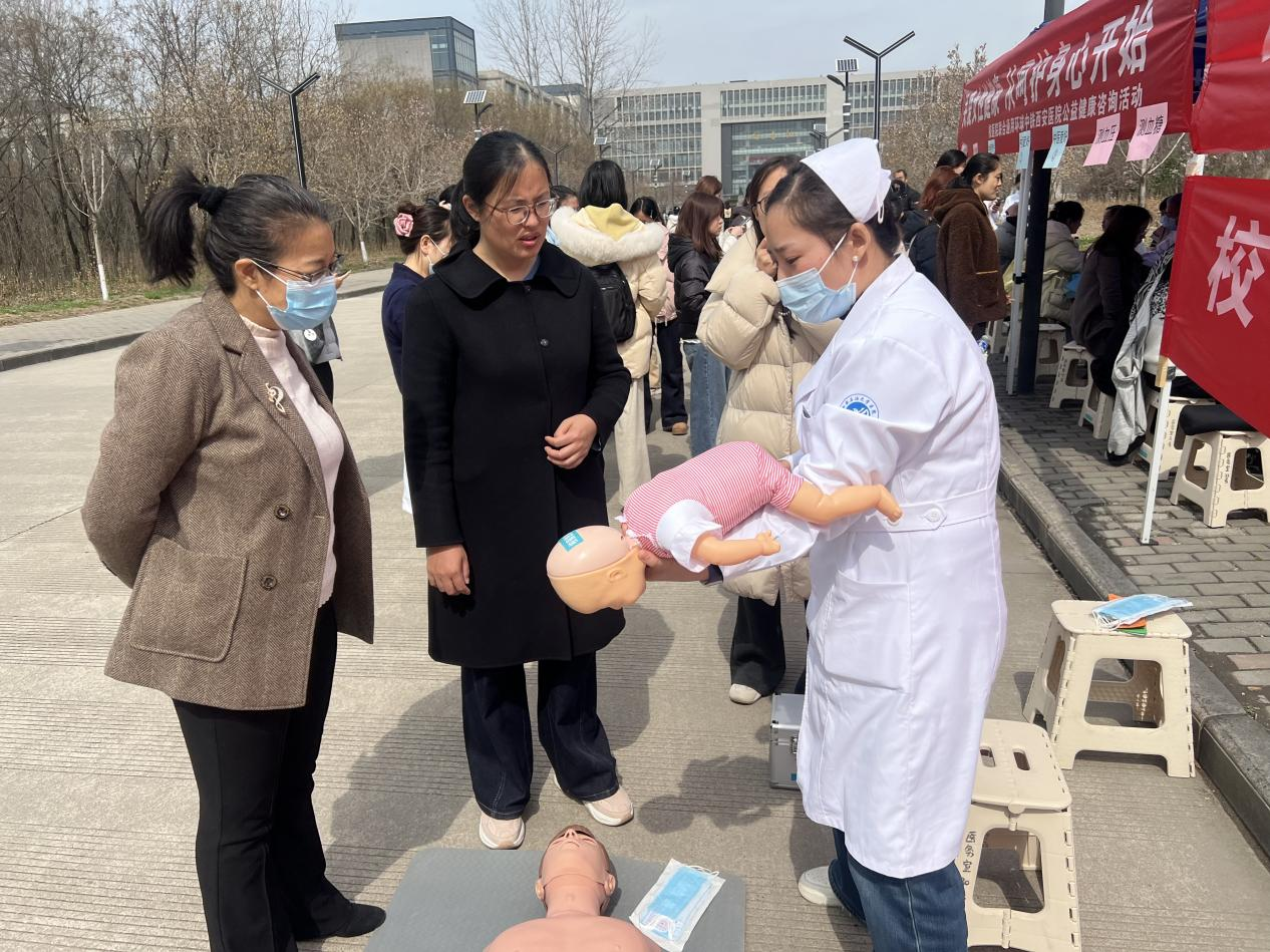 3月6日中午,鄠邑校区以“关爱女性健康,从呵护身心开始”为主题的专场健康咨询在东区食堂对面举行。通用环球中铁西安医院王娜娜、任朝伟、员海娟,及校医院王凯、李佳晨、齐琳婧等专家组成健康咨询团队,提供女性常见病咨询、中医体质辨识、内分泌调理、肿瘤预防等服务。现场开设血压、血糖免费检测点,校医院急救教育团队聚焦校园场景普及心肺复苏与海姆立克急救法,践行“人人学急救,急救为人人”理念。活动增设趣味小游戏与健康知识问答环节,为参与者发放精美小礼品,现场氛围温馨热烈、秩序井然。