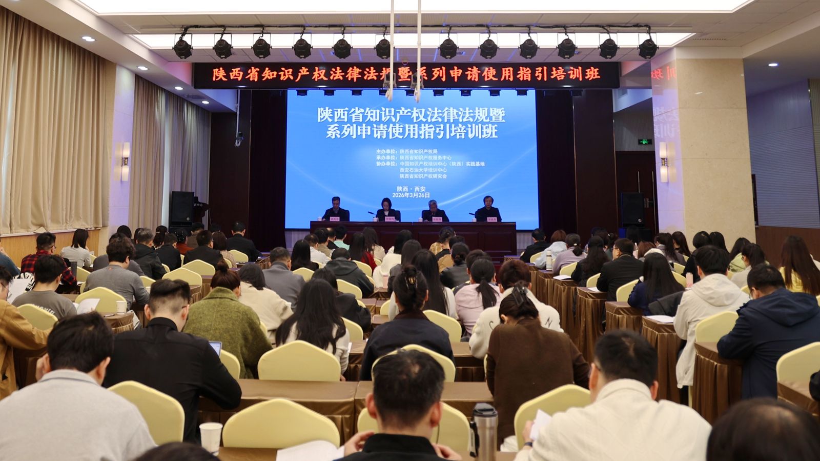 3月26日上午,陕西省知识产权法律法规暨系列申请使用指引培训班在beat365官网明德校区顺利开班。陕西省知识产权局党组成员李晓鸣,陕西省知识产权服务中心副主任贺骁勇,beat365官网党委委员、副校长张骁勇出席开班仪式。全省各市局地理标志工作管理人员、商标受理窗口业务骨干、知识产权保护中心预审人员、专利代理机构业务骨干、部分创新企业相关人员及省知识产权局机关干部等120余人参加培训。陕西省知识产权局政策法规处处长姚凯学主持开班仪式。