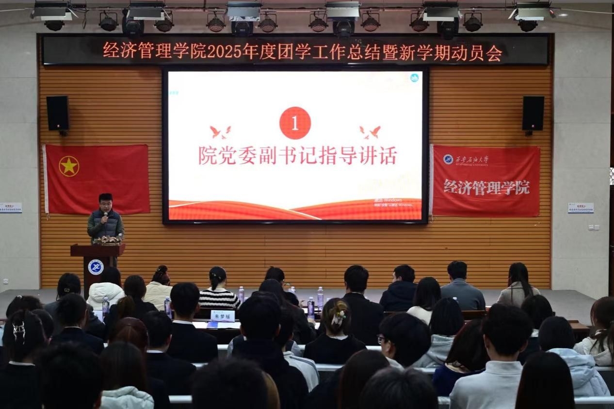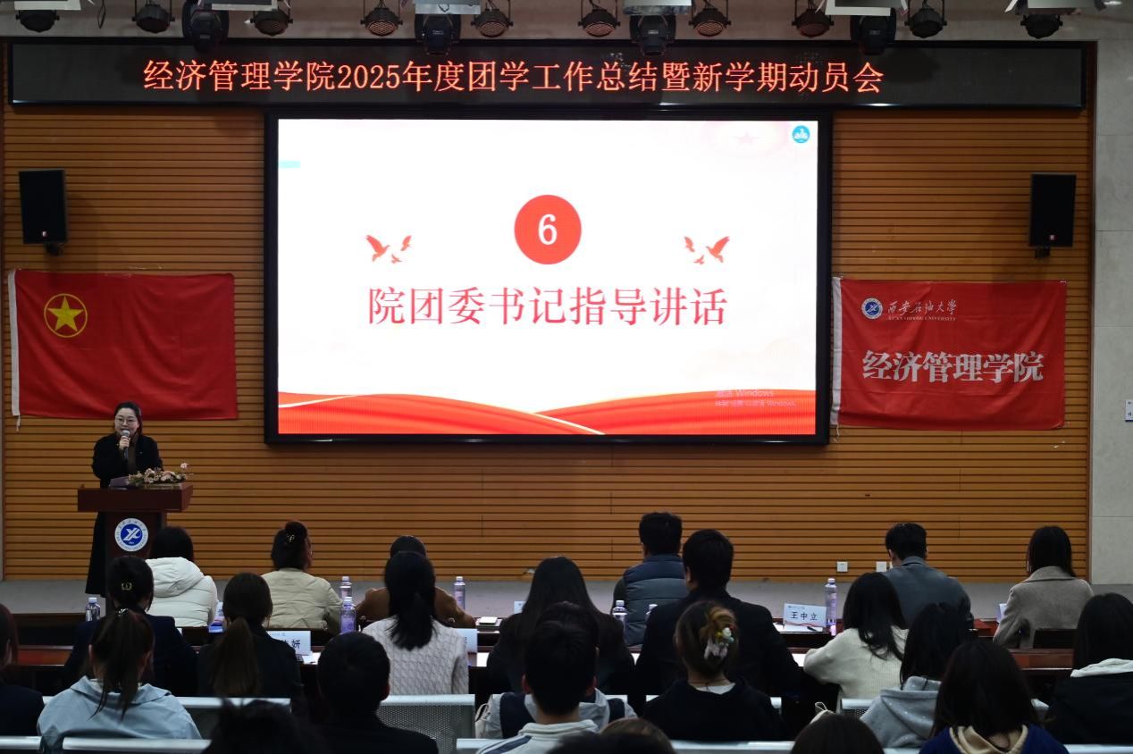 为全面总结学院2025年度团学工作成果,凝聚奋进力量,部署新学期工作任务,beat365正版唯一官网经济管理学院于3月25日下午在鄠邑校区就业指导中心多功能厅召开2025年度团学工作总结暨新学期工作动员大会。经济管理学院党委副书记赵纪飞、院团委书记张硕、学院专兼职辅导员及全体团学干部参会。