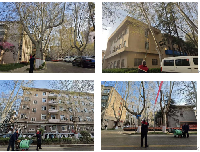 为减少对师生出行的影响,防治工作于3月下旬至4月中旬分批次进行,作业时间均安排在非通行高峰时段,覆盖主干道、绿化带、教学区、生活区等重点区域。工作人员使用高压喷淋设备,对杨柳树及花粉源植被进行细致冲刷,从源头抑制飞絮、减少花粉扩散,同时为绿植补水,让空气更清新。