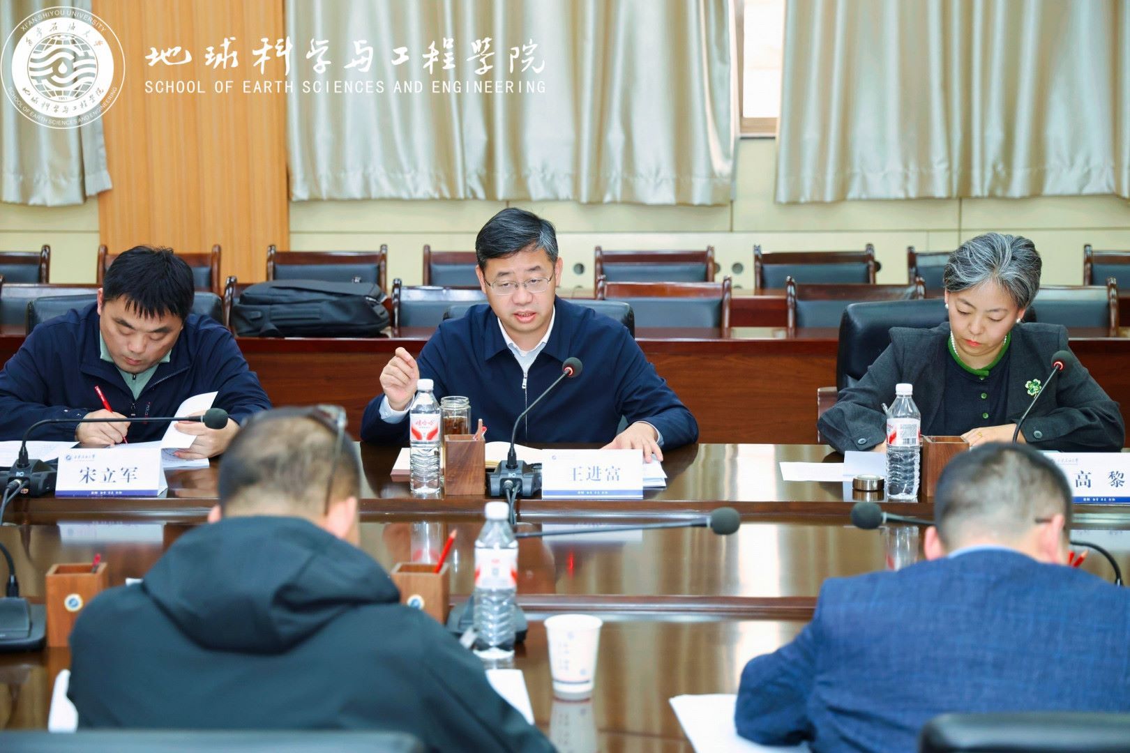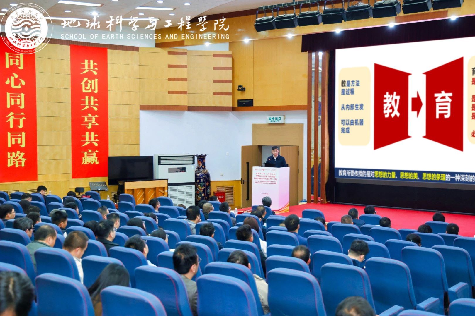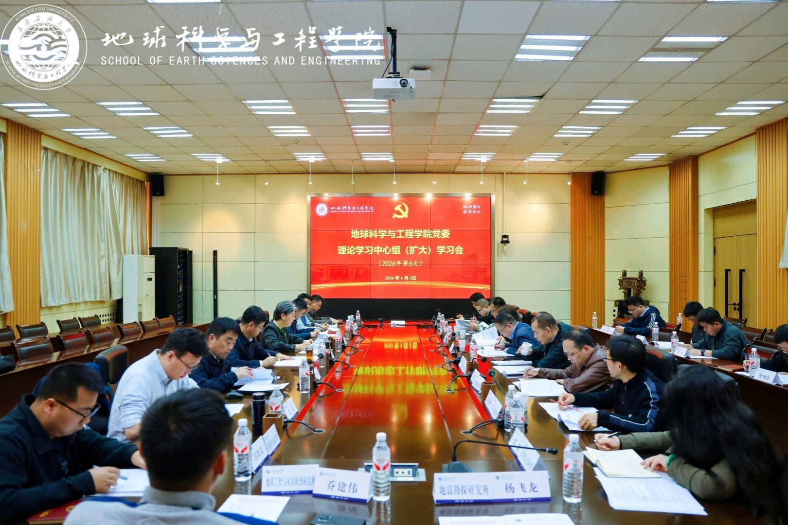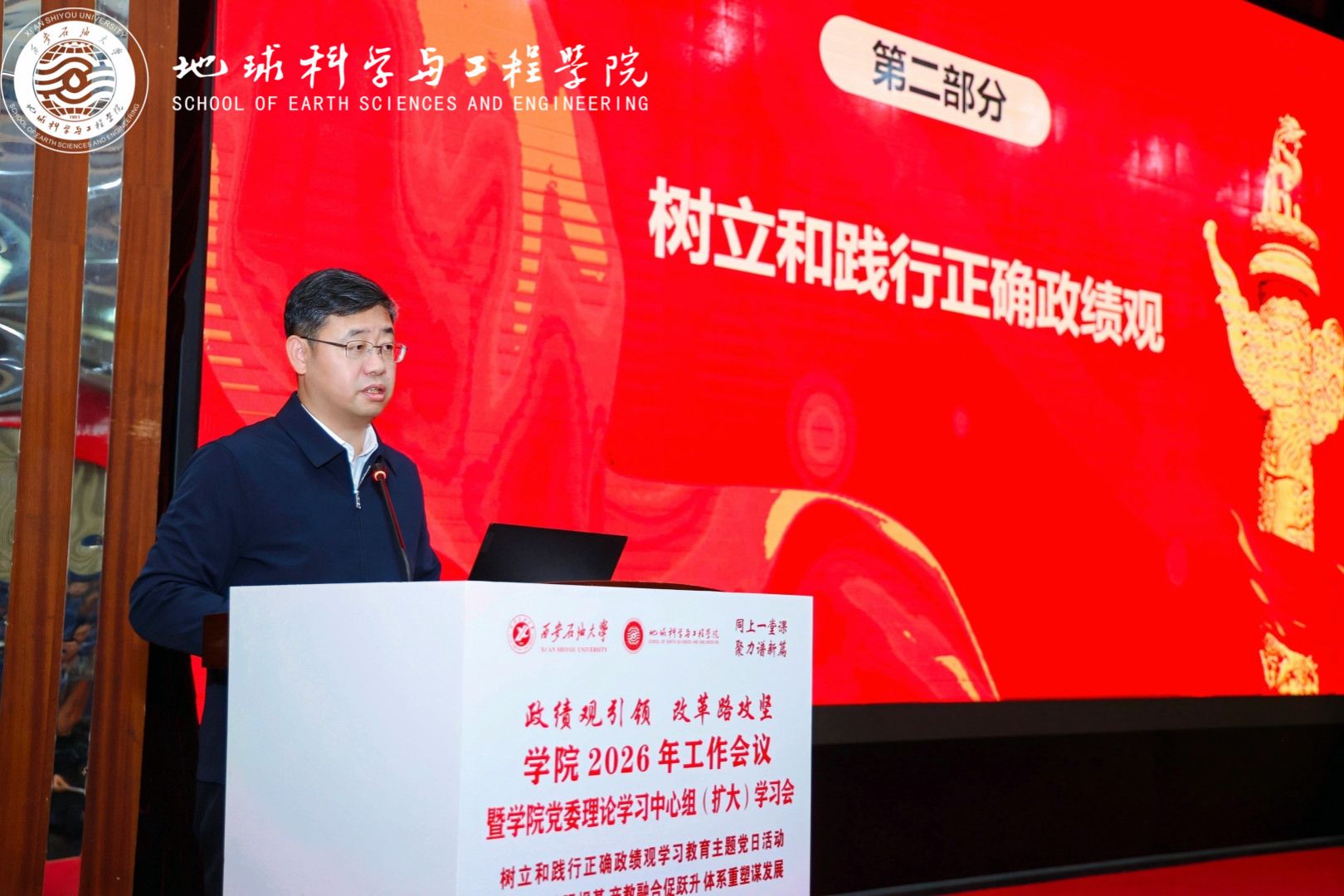 为贯彻落实学校“体系重塑年、质量跃升年、改革攻坚年”建设部署,深入推进树立和践行正确政绩观学习教育,4月2日,地球科学与工程学院“同上一堂课 聚力谱新篇”2026年工作会议暨党委理论学习中心组(扩大)学习会在雁塔校区举行。会议以“政绩观引领、改革路攻坚”为主线,围绕“党建赋能强根基、产教融合促跃升、体系重塑谋发展”主题,通过专题思政课、专题党课、学院工作报告、中心组学习研讨及警示教育等环节,凝聚发展共识,明确攻坚方向。校长王进富到会指导并为与会人员讲授专题思政课和党课。学院党委书记高黎主持会议,学院领导班子成员、全体教职工及研究生代表参加会议。