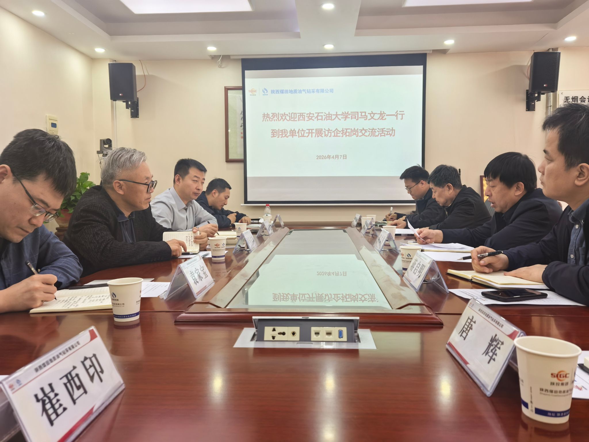 4月7日,石油工程学院党委书记司马文龙、副书记艾二鑫,新能源学院党委副书记袁家宝一行赴陕西煤田地质油气钻采有限公司开展访企拓岗。陕西煤田地质油气钻采有限公司总经理郭文祥等领导出席会议。在座谈会上,司马文龙详细介绍了石油工程学院的专业特色、人才培养模式及2026届毕业生情况,他表示,学院始终坚守“面向行业、服务企业”的办学理念,希望通过此次走访,进一步了解企业对高素质技术技能人才的具体要求,消除企业与高校、企业与学生之间的就业信息差,实现人才培养与岗位需求的“无缝对接”,助力毕业生高质量就业。